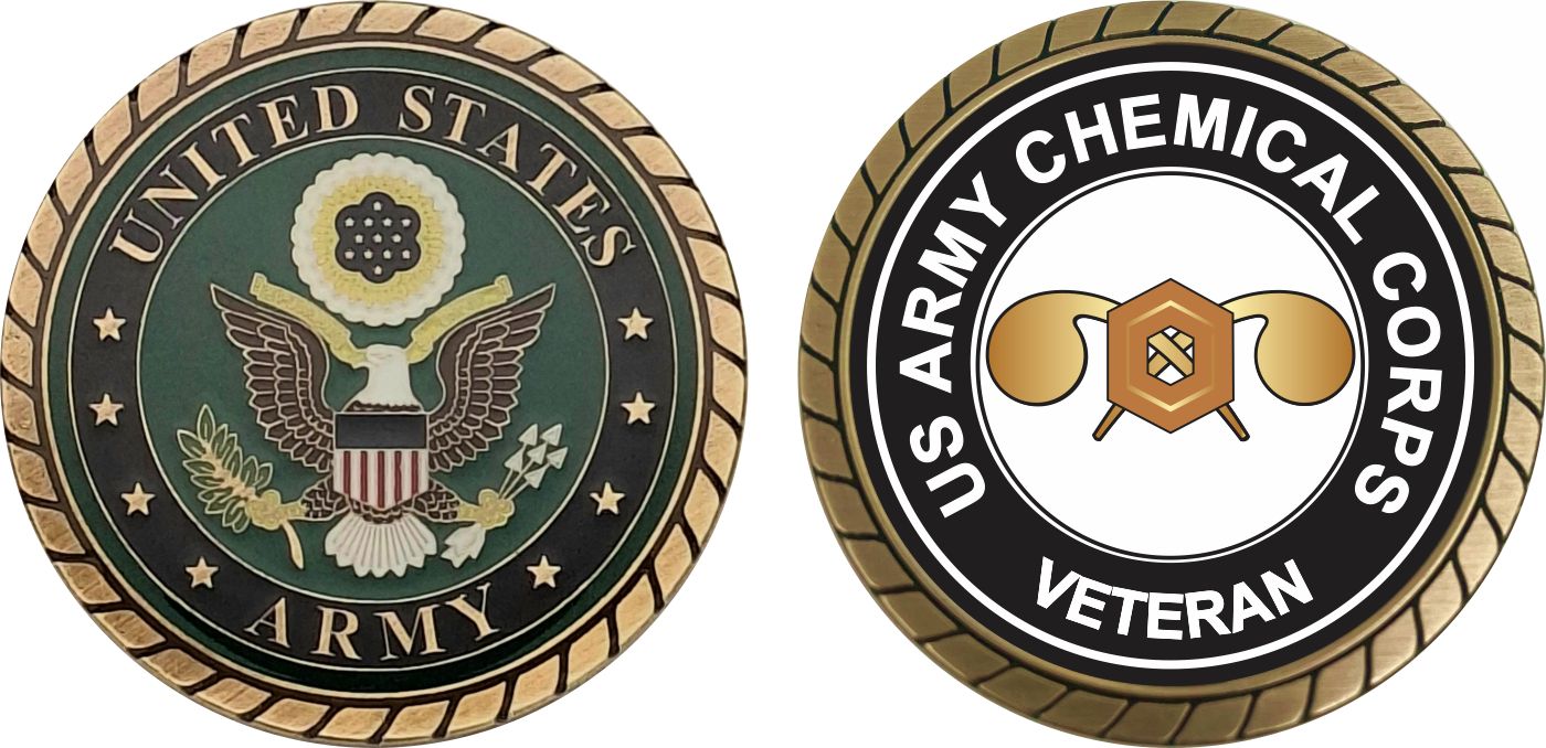 This 1 3/4” U.S. Army Veteran Chemical Corps Challenge Coin is proudly offered by MilitaryBest. This Officially Licensed Army coin has beautiful enamel finish on one side and an organized crisp clean U.S. Army Veteran Chemical Corps design on the opposite side.