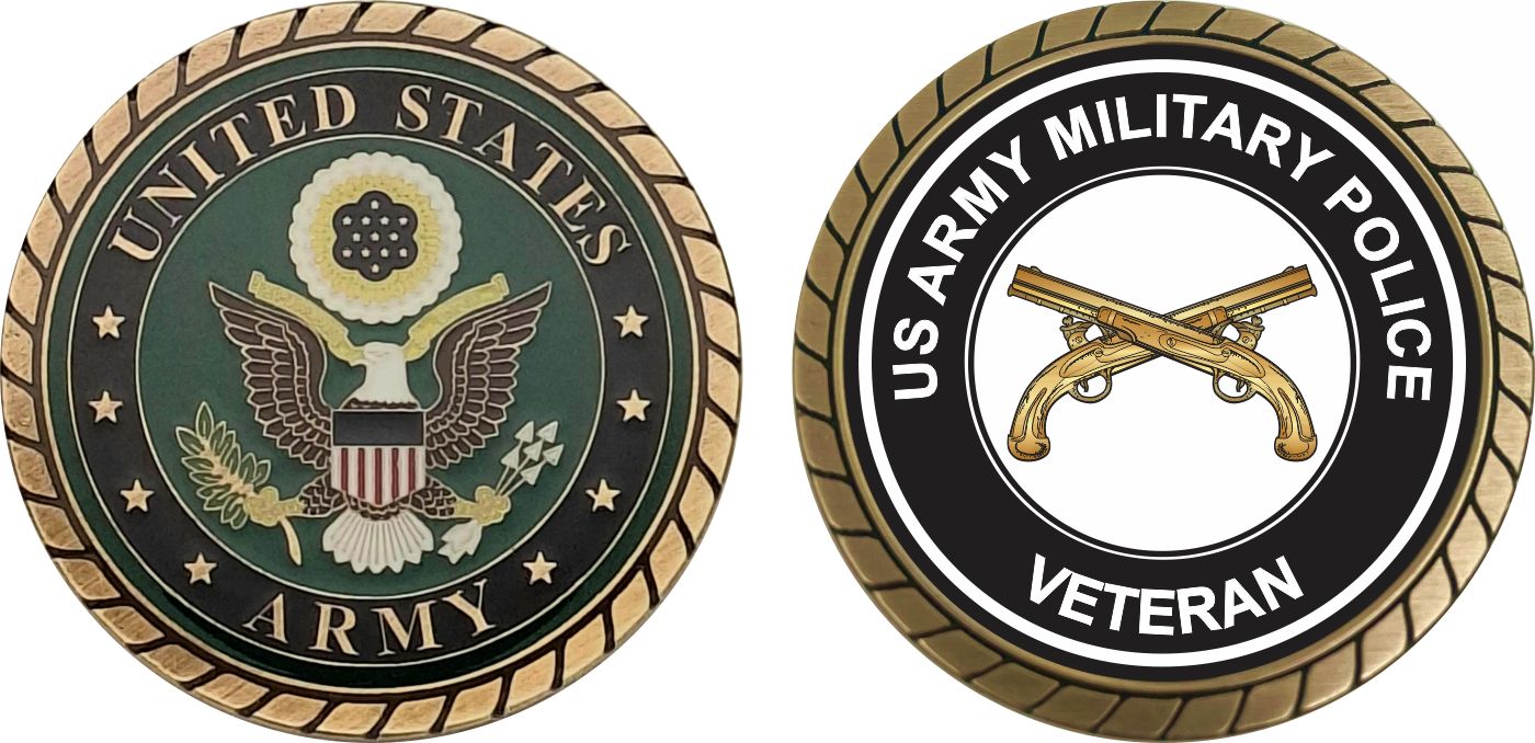 This 1 3/4” U.S. Army Veteran Military Police Challenge Coin is proudly offered by MilitaryBest. This Officially Licensed Army coin has beautiful enamel finish on one side and an organized crisp clean U.S. Army Veteran Military Police design on the opposite side.