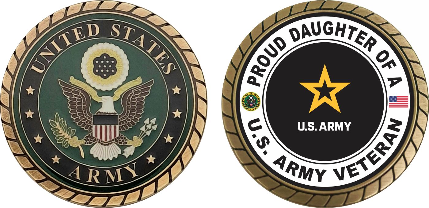 This 1 3/4” U.S. Army Veteran Proud Daughter Challenge Coin is proudly offered by MilitaryBest. This Officially Licensed Army coin has beautiful enamel finish on one side and an organized crisp clean U.S. Army Veteran Proud Daughter design on the opposite side.