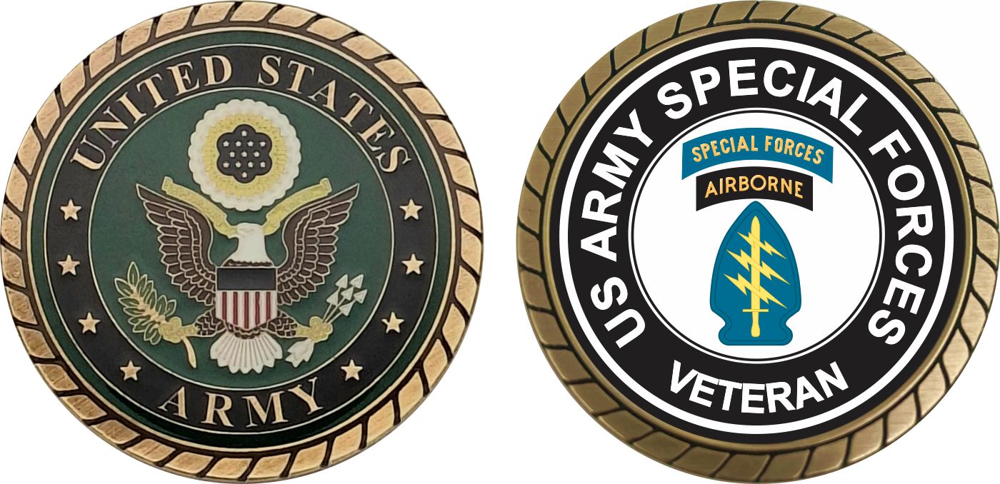 This 1 3/4” U.S. Army Veteran Special Forces Airborne Challenge Coin is proudly offered by Militarybest. This Officially Licensed Army coin has beautiful enamel finish on one side and an organized crisp clean Special Forces Airborne design on the opposite side.
