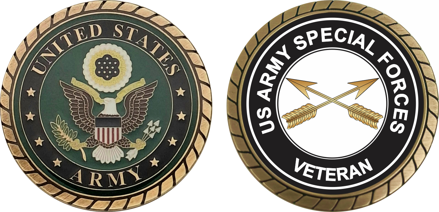 This 1 3/4” U.S. Army Veteran Special Forces Challenge Coin is proudly offered by MilitaryBest. This Officially Licensed Army coin has beautiful enamel finish on one side and an organized crisp clean U.S. Army Veteran Special Forces design on the opposite side.
