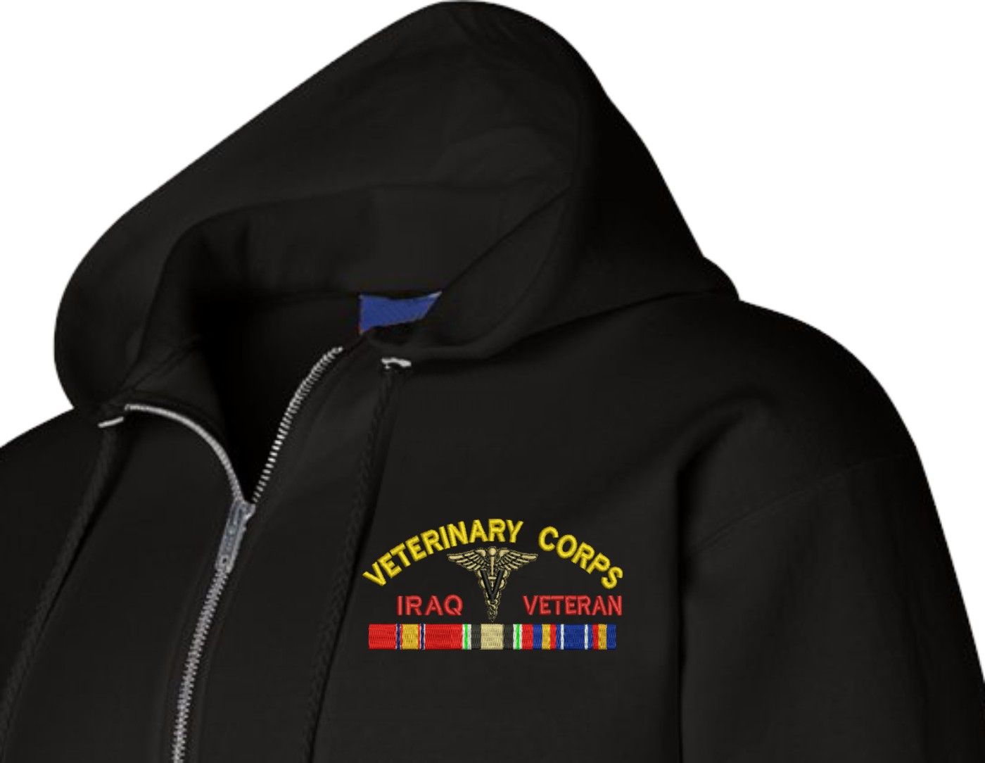 MilitaryBest has expanded its line of apparel with this custom embroidered U.S. Army Veterinary Corps Iraq Veteran Zippered Hoodie. Each Hoodie is direct embroidered onto a Champion brand 9.5 oz 50/50 Cotton Poly blend. This will make an excellent addition to your wardrobe, or a great gift. Your satisfaction is Guaranteed! These quality zippered hoodies are proudly embroidered at our facilities in Scottsboro, AL. Support the Army MWR program by purchasing only from Licensed Vendors.