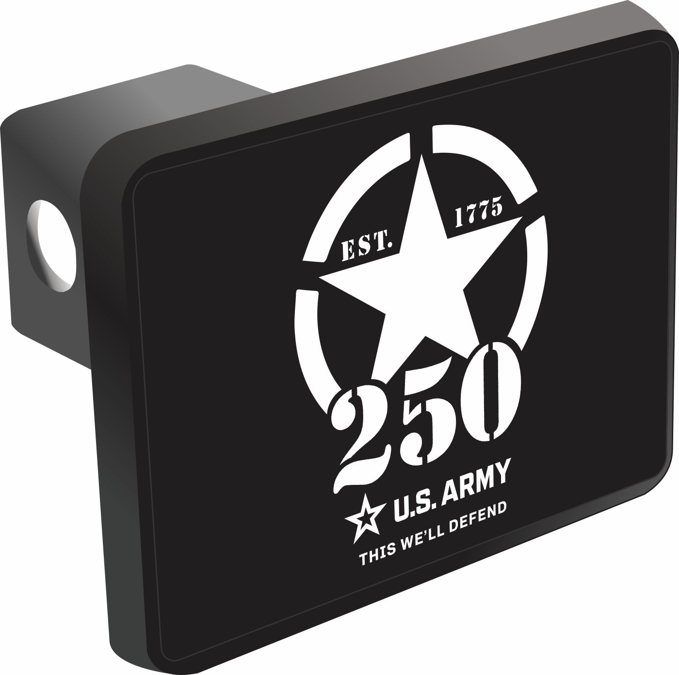 This U.S. Army 250th Anniversary Hitch Cover is proudly Made in the USA. Each Hitch Cover's face plate measures 4.7" x 3.4" and is applied on a black heavy duty injection molded plastic 2" hitch cover; link pin not included. The face plate of the hitch cover is sublimation printed to provide a beautiful glossy finish sure to catch the eye. This hitch cover would make a wonderful addition to your truck or other vehicle.A percentage of the sale of each MilitaryBest item is forwarded to the licensing departments of each respective branch of service in support of the MWR (Morale, Welfare, & Recreation) program. These payments are made by either ALL4U LLC or the wholesaler from where the item originated. Our team thanks you for your service and your support of these programs.