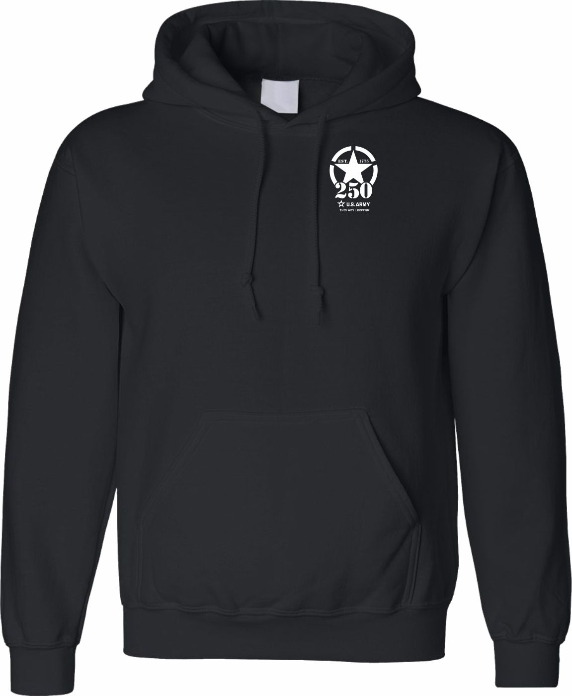 MilitaryBest is proud to offer this fine U.S. Army 250th Anniversary Printed Hoodie. The design is printed directly on the shirt selected. This shirt is available with several options for the image on the front of the shirt, such as a smaller design in the top left or a full size design across the entire chest. Each shirt is proudly printed in the USA.