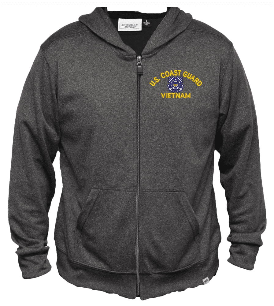 MilitaryBest proudly offers this top-quality U.S. Coast Guard Vietnam Men's 100% Polyester Heather Grey Full-Zip Hoodie. We have proudly partnered with Authentically American to offer you this Made in the USA Hoodie. Water & wrinkle resistance make this zip hoodie the perfect layering piece from the golf course to you favorite travel destination.As with all MilitaryBest items, our designs are Officially Licensed. A percentage of the sale of each MilitaryBest item is forwarded to the licensing department in support of it's MWR (Morale, Welfare, & Recreation) program. These payments are made by either ALL4U LLC or the wholesaler from where the item originated. Our team thanks you for your service and your support of these programs.