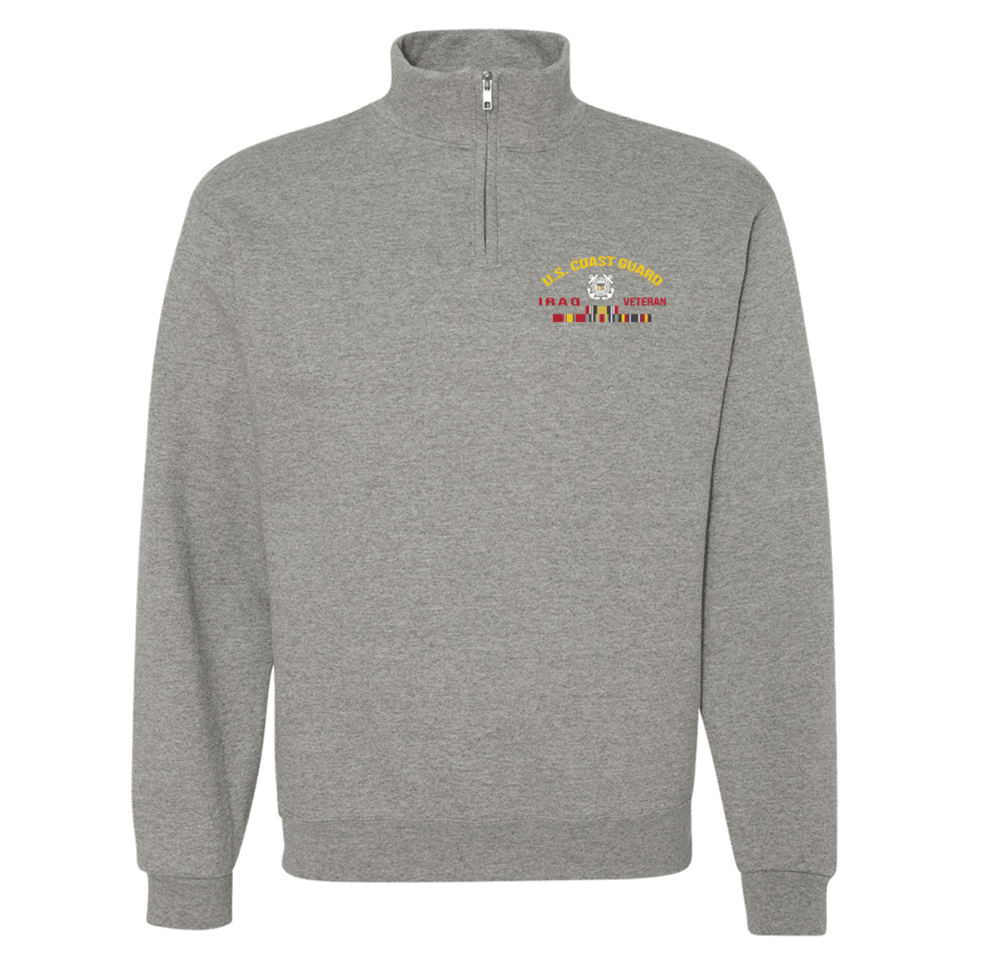 This U.S. Coast Guard Iraq Veteran Quarter-Zip makes an excellent addition to your wardrobe or a fine gift and features High stitch density Nublend® pill-resistant fleece, Pre-shrunk 50/50 cotton/polyester and a Concealed 7"" zipper. The graphic is state of the art DTF film.It is available in 3 colors - Black, Navy Blue and Oxford Gray.