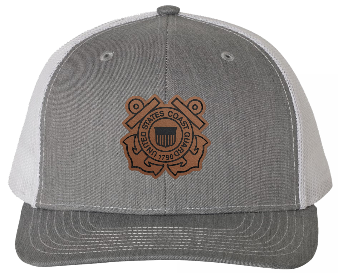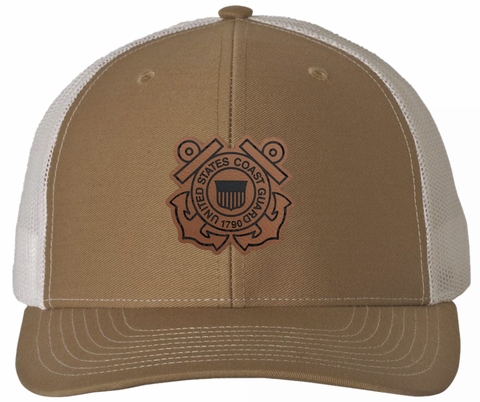 We are proud to offer this U.S. Coast Guard Leather Patch Cap. These caps are 100% Made in the USA! Each leather patch is applied to a 6 Panel - Mid Profile cap. All of our 2-tone colored caps are made with a white mesh backing, except for OD Green which has a black mesh backing.Caps ordered with custom embroidered personalized back text require an additional 2 to 3 days production time. All custom back text will be embroidered in ALL CAPITAL LETTERS. Caps personalized with back text are non-returnable unless there is a material defect in the cap.