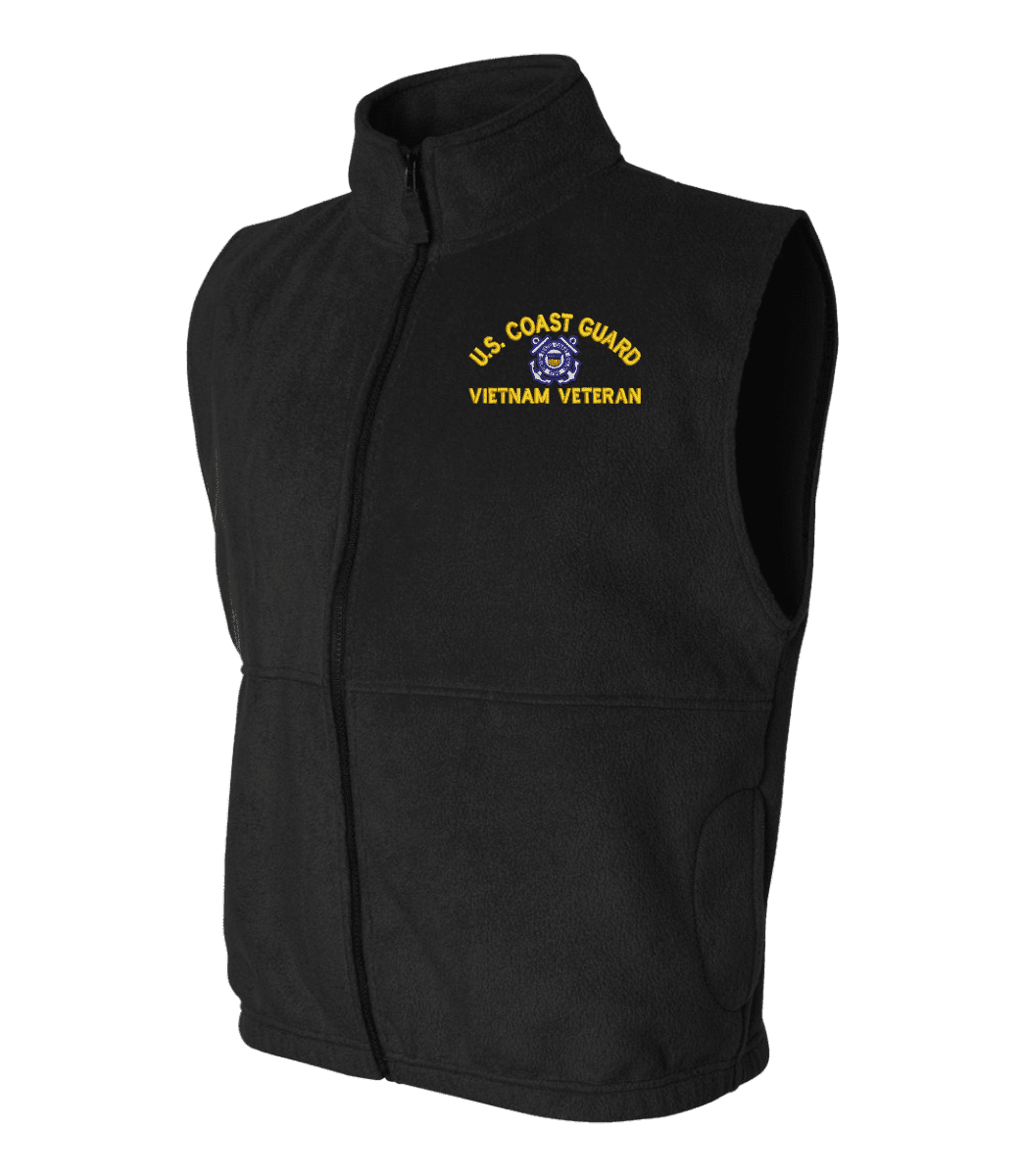Due to supply chain disruptions, some colors and sizes may not be available in the same Brand, in these cases a brand of comparable quality will be used. Feel free to call in advance of your order, with questions you may have.MilitaryBest is expanding its line of Men's apparel with this quality U.S. Coast Guard Vietnam Veteran Full-Zip Fleece Vest. This U.S. Coast Guard Vietnam Veteran Full-Zip Fleece Vest features a convertible collar with dyed-to-match zipper pull, oversized nylon reinforced slash pockets, and an elastic hem. It is made using a 100% anti-pill polyester Fleece Vest. This U.S. Coast Guard Vietnam Veteran Full-Zip Fleece Vest will make an excellent addition to your wardrobe, or a quality gift. Your satisfaction is guaranteed! These Vests are custom embroidered at our facilities in Scottsboro, AL.