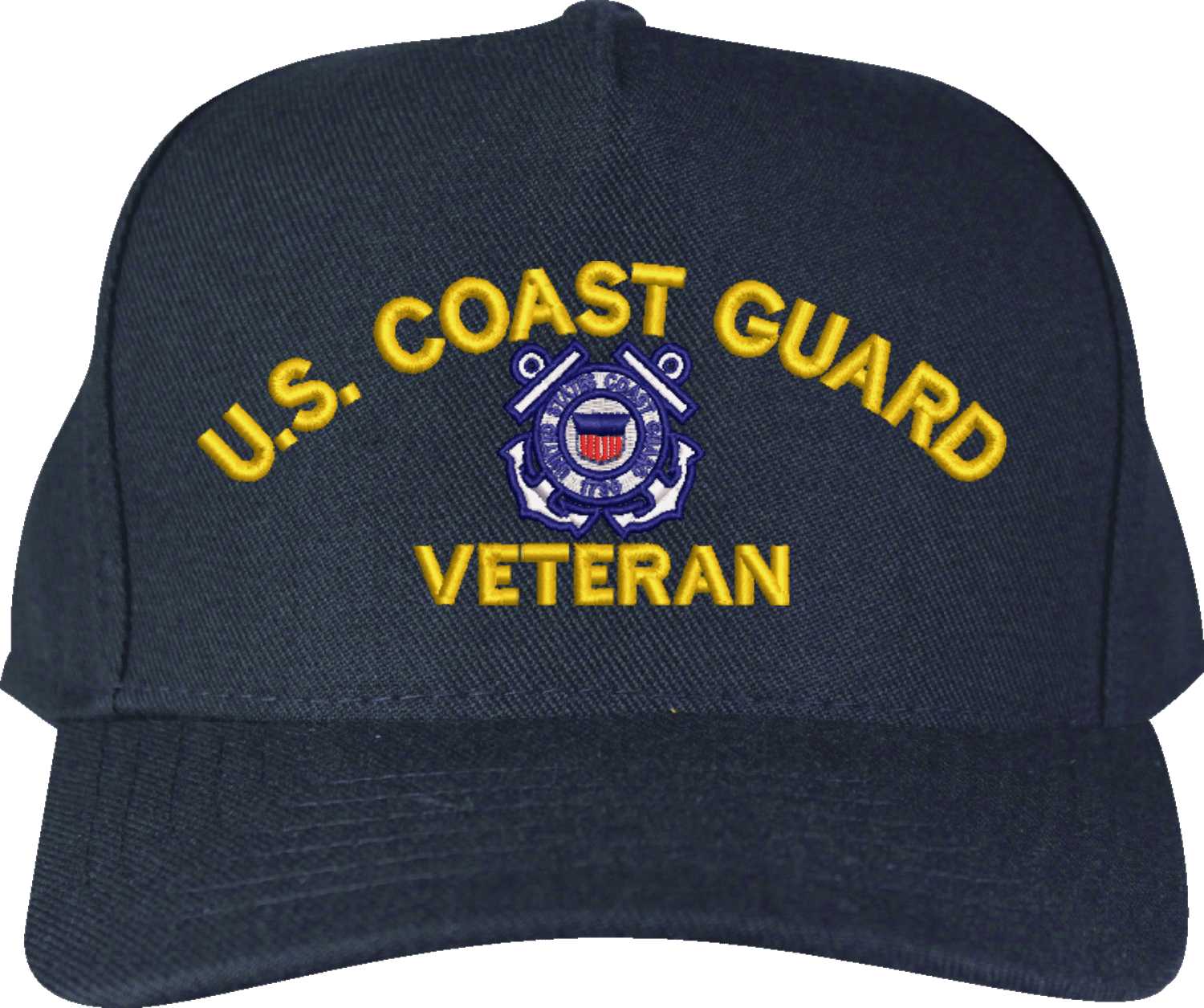MilitaryBest is proud to offer this quality U.S. Coast Guard Veteran Embroidered Cap. This cap is available in either 5 panel high profile or 6 panel low profile styling. This U.S. Coast Guard Veteran Embroidered Cap will make a great addition to your collection or a great gift. You are sure to be the envy of all your veteran buddies. This U.S. Coast Guard Veteran Embroidered Cap is embroidered at our facilities in Scottsboro, AL by skilled craftsmen with a passion for patriotism. Your satisfaction is guaranteed!We will be glad to include scrambled eggs. For caps ordered with custom embroidered personalized text please allow an additional 3 to 5 days production time. All custom back text will be embroidered in ALL CAPS. Caps with back text or eggs are non-returnable unless there is a material defect in the cap. Unless specified otherwise text will be embroidered with traditional yellow/gold thread.