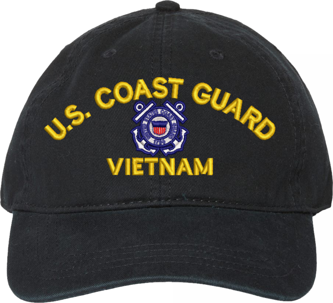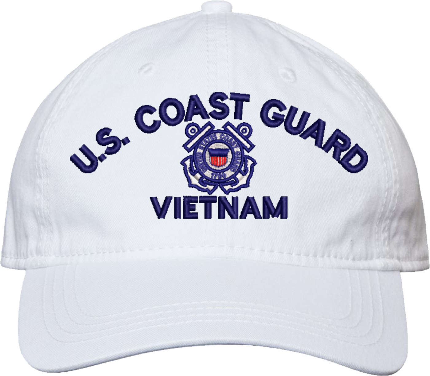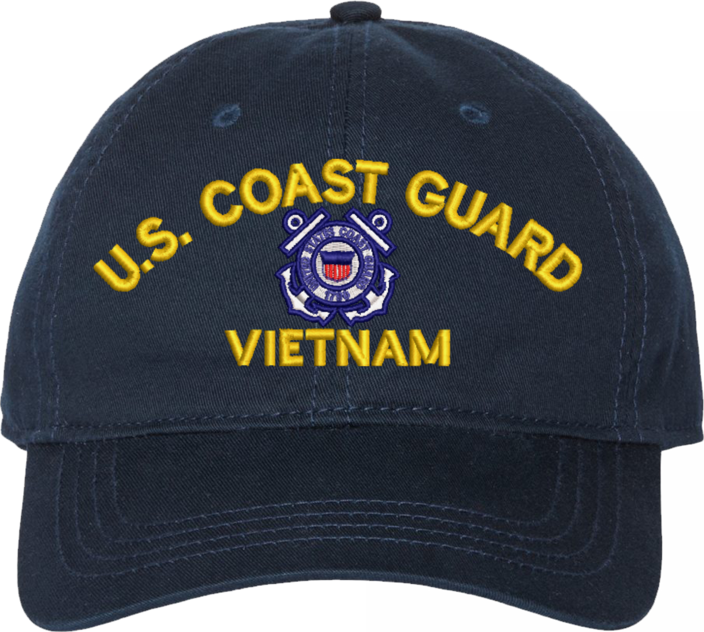 Show your Coast Guard pride with this U.S. Coast Guard Vietnam Unstructured Dad Cap from MilitaryBest. Crafted from 100% washed chino twill cotton, this six-panel, low-profile cap offers a relaxed and comfortable fit. Featuring high-quality embroidery done in our Scottsboro, Alabama facility, this cap is designed with a pre-curved visor and an adjustable tri-glide buckle closure for a perfect fit. Whether for everyday wear or as a meaningful gift, this cap is a great way to honor your own or a loved one's service.For caps ordered with custom embroidered personalized text please allow an additional 3 to 5 days production time. All custom back text will be embroidered in ALL CAPITAL LETTERS. Caps with back text or eggs are non-returnable unless there is a material defect in the cap.
