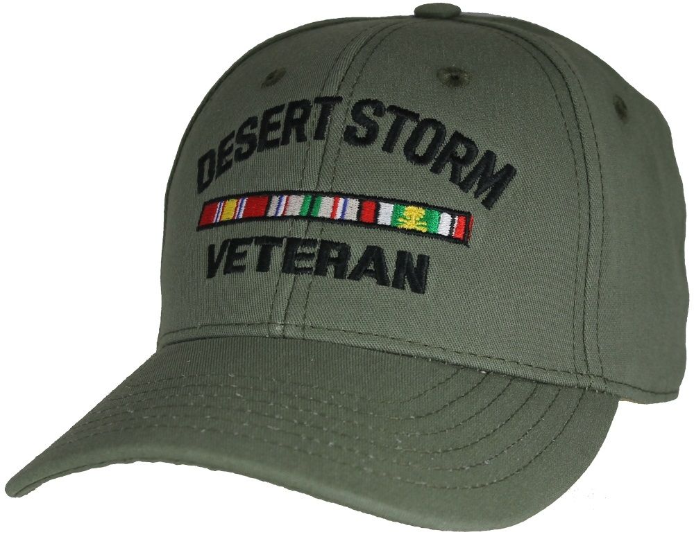 This Desert Storm Veteran OD Green Ball Cap is directly embroidered onto a cotton twill cap with a sandwich trim. Each Made in the USA Desert Storm Cap has a Each has an adjustable strap embroidered strap. All of our Military hats are fully guaranteed.Some people call them Military Covers or Military Hats.* Please note, the OD Green material used to make this cap is "distressed" and color variations will occur. This includes, but not limited to, areas of fading, pilling, and/or small tears present on the cap that may not appear in the product listing as pictured.