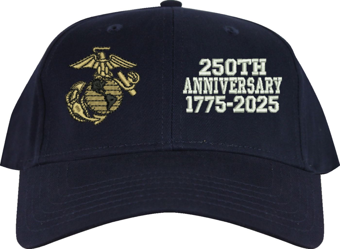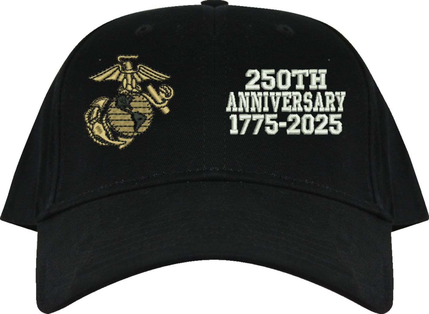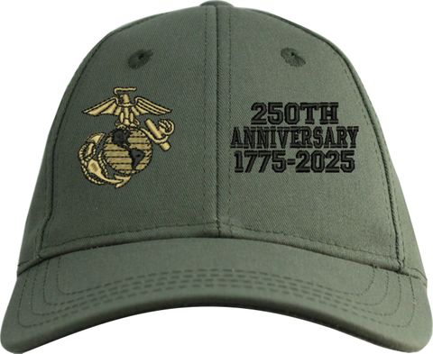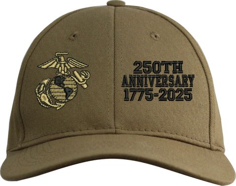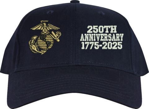 MilitaryBest is proud to offer this quality U.S. Marine Corps 250th Anniversary Split Design Embroidered Cap. This cap is available in either 5 panel high profile or 6 panel low profile styling. This cap will make a great addition to your collection or a great gift. This cap is crafted by our skilled embroidery technicians at our facilities in Scottsboro, AL.. Your satisfaction is guaranteed!For caps ordered with custom embroidered personalized text please allow an additional 3 to 5 days production time. All custom text will be embroidered in ALL CAPS. Caps with custom text or eggs are non-returnable unless there is a material defect in the cap.