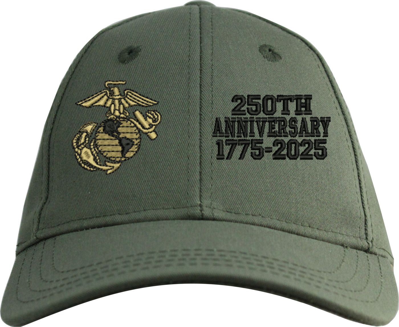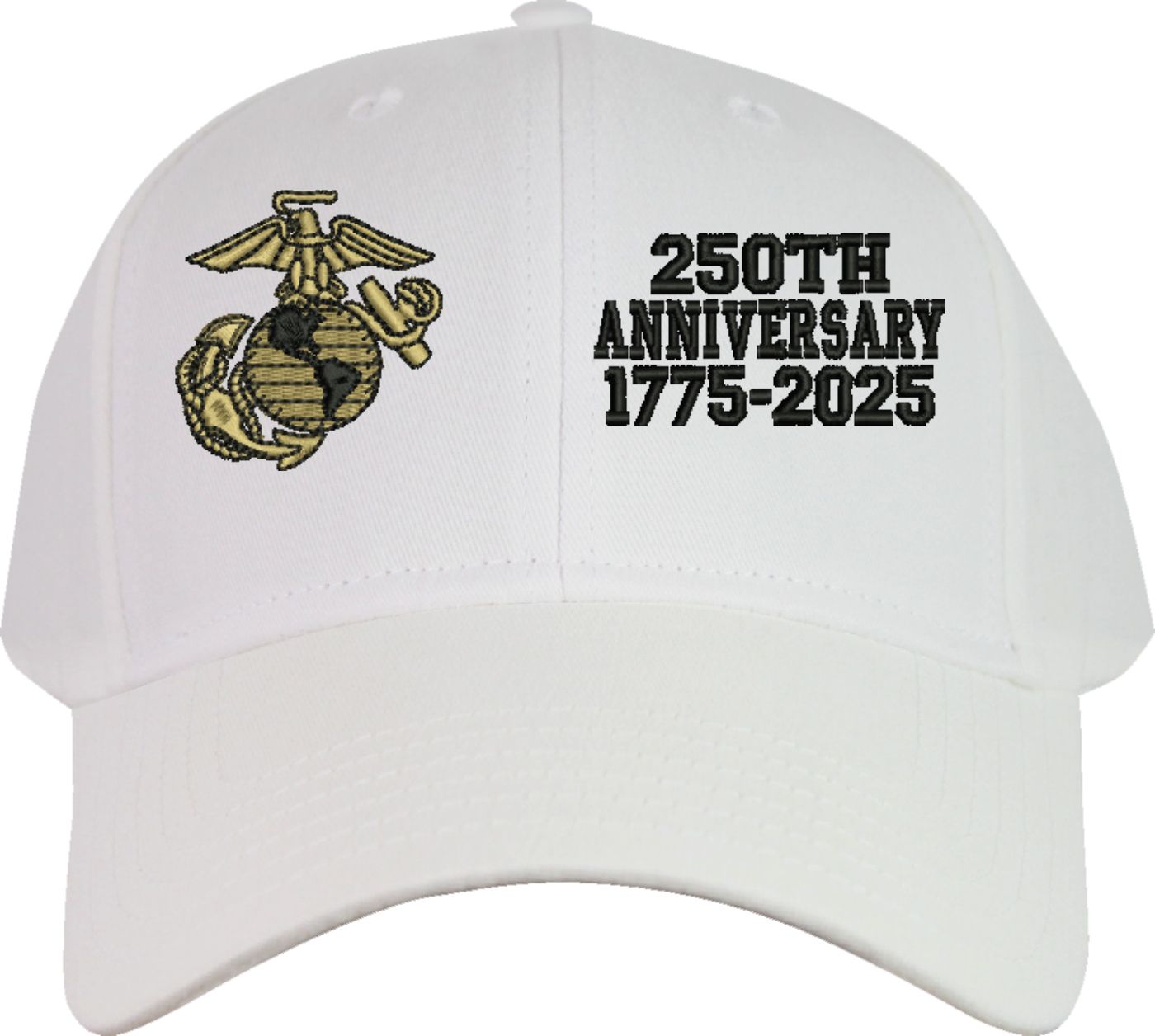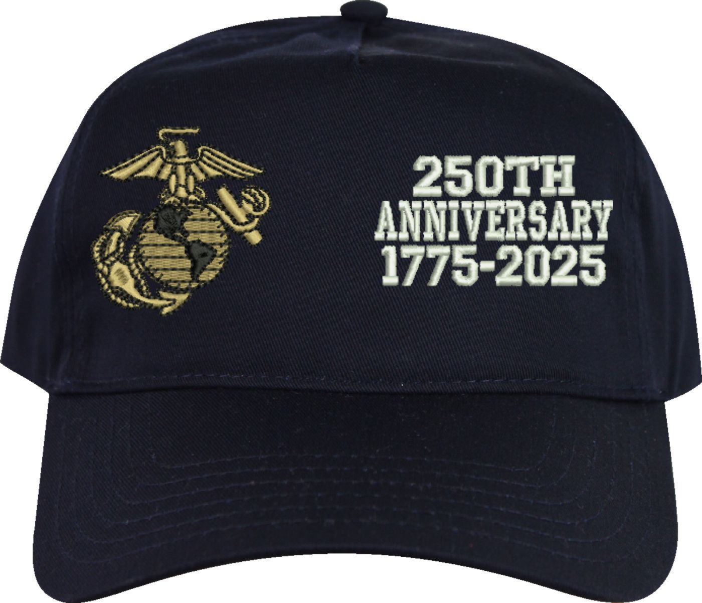 MilitaryBest is proud to offer this quality U.S. Marine Corps 250th Anniversary Split Design Embroidered Cap. This cap is available in either 5 panel high profile or 6 panel low profile styling. This cap will make a great addition to your collection or a great gift. This cap is crafted by our skilled embroidery technicians at our facilities in Scottsboro, AL.. Your satisfaction is guaranteed!For caps ordered with custom embroidered personalized text please allow an additional 3 to 5 days production time. All custom text will be embroidered in ALL CAPS. Caps with custom text or eggs are non-returnable unless there is a material defect in the cap.