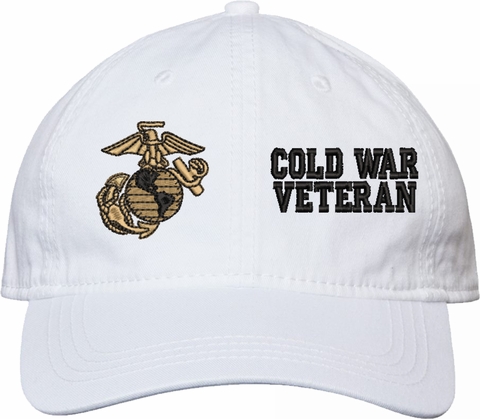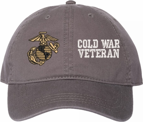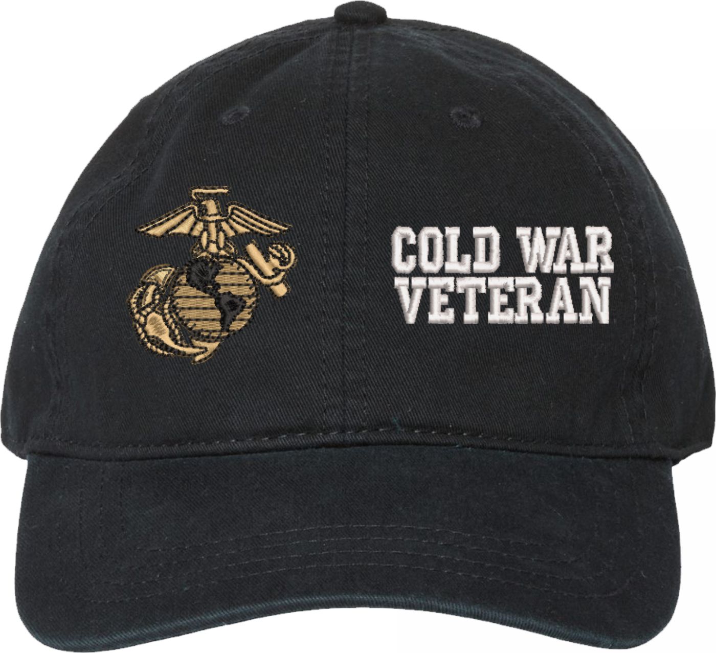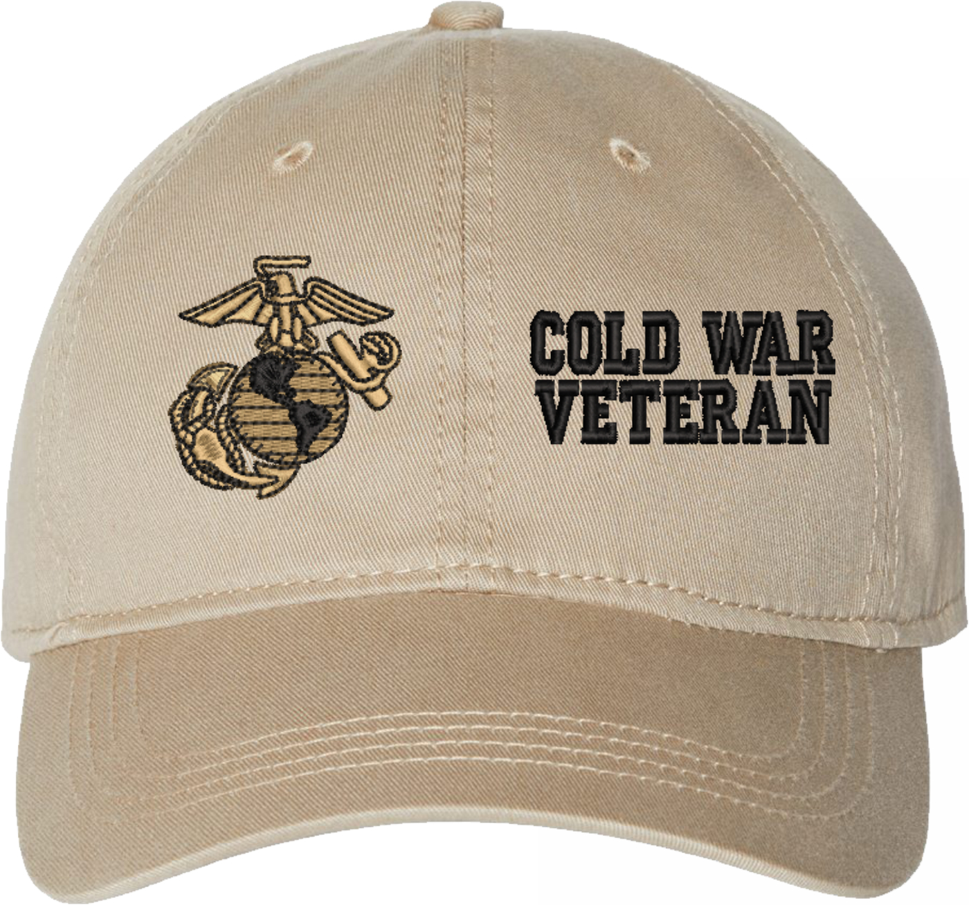 Show your Marine Corps pride with this U.S. Marine Corps Cold War Veteran Unstructured Dad Cap from MilitaryBest. Crafted from 100% washed chino twill cotton, this six-panel, low-profile cap offers a relaxed and comfortable fit. Featuring high-quality embroidery done in our Scottsboro, Alabama facility, this cap is designed with a pre-curved visor and an adjustable tri-glide buckle closure for a perfect fit. Whether for everyday wear or as a meaningful gift, this cap is a great way to honor your own or a loved one's service.For caps ordered with custom embroidered personalized text please allow an additional 3 to 5 days production time. All custom back text will be embroidered in ALL CAPITAL LETTERS. Caps with back text or eggs are non-returnable unless there is a material defect in the cap.