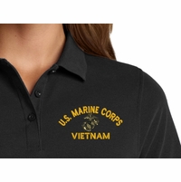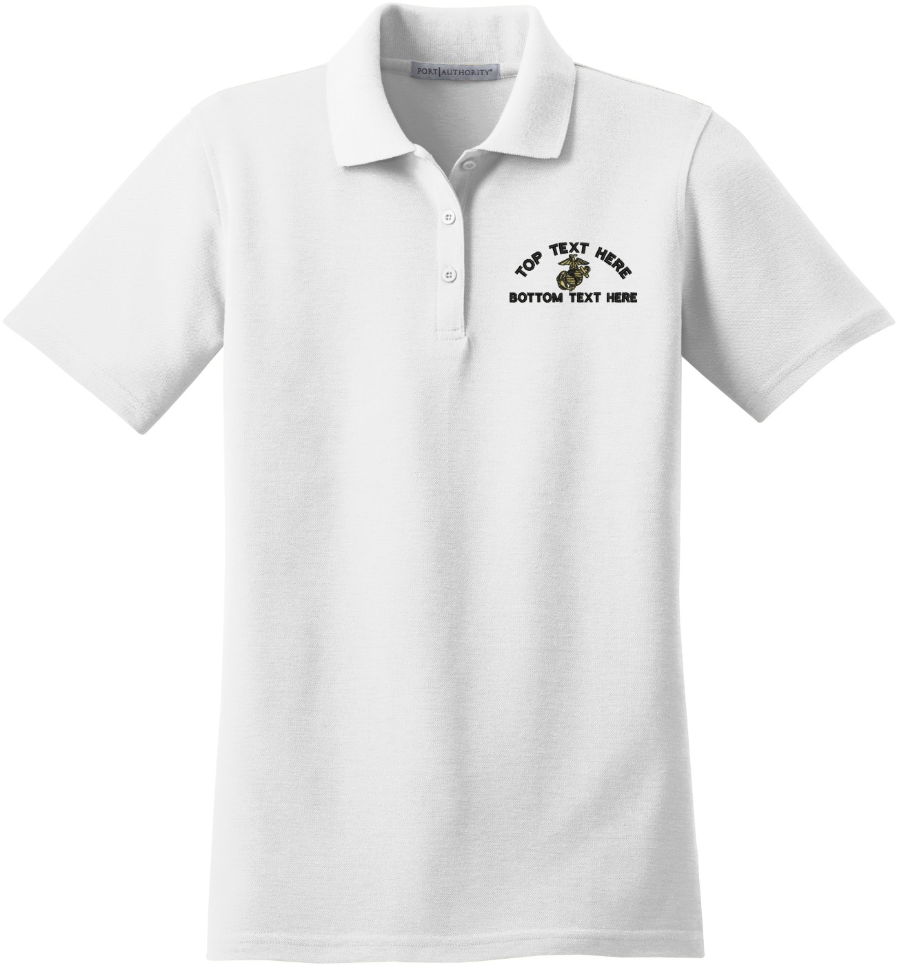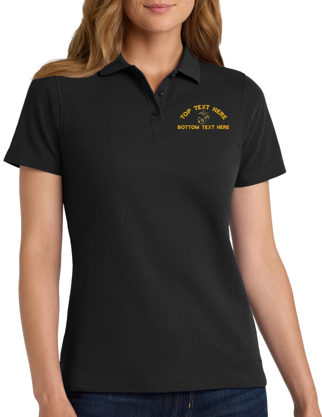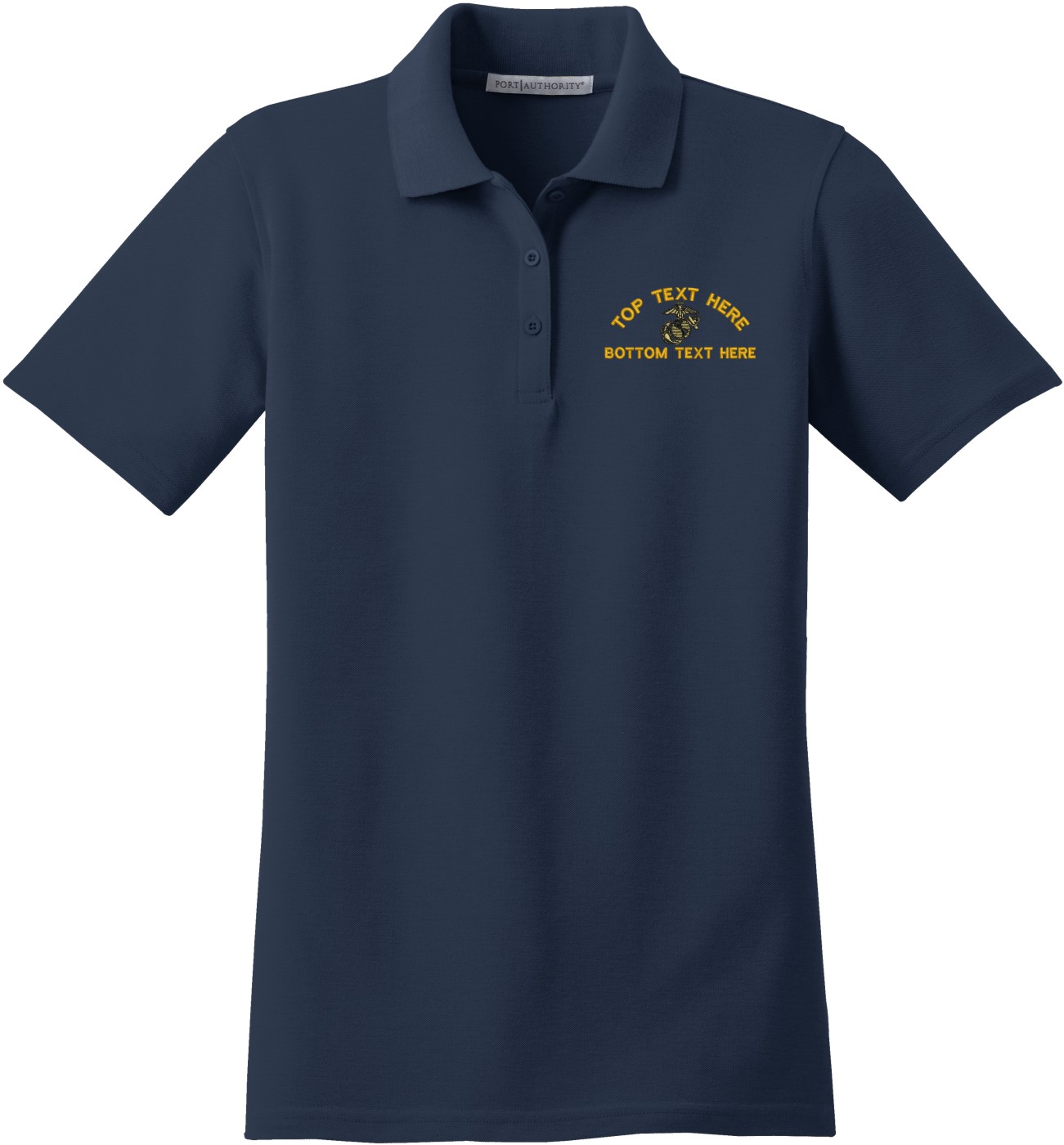 MilitaryBest is proud to offer this U.S. Marine Corps Custom Women's Stain-Release Polo. This polo is embroidered by our MilitaryBest team in Northeast Alabama. These polos are made with a stain-release finish for long-lasting wear, odor-fighting properties, and superior wrinkle and shrink resistance.
