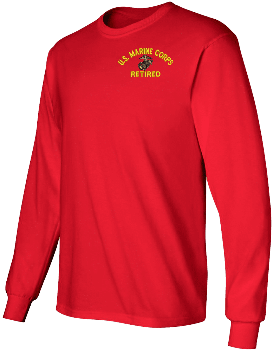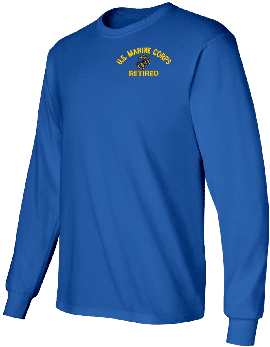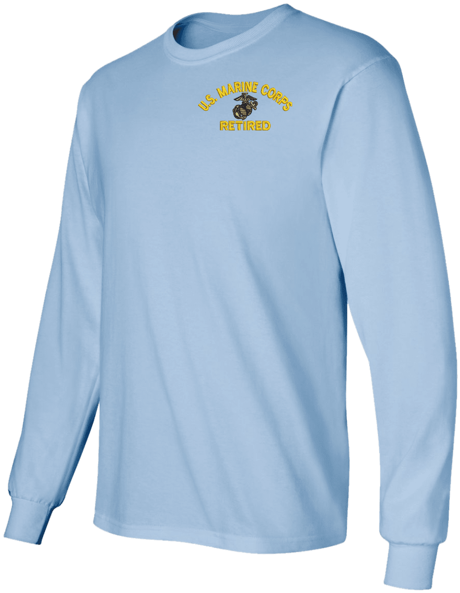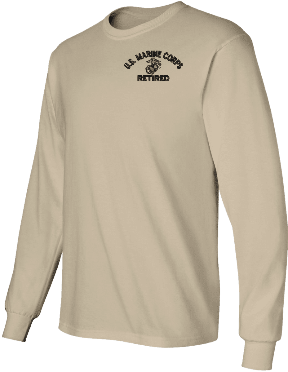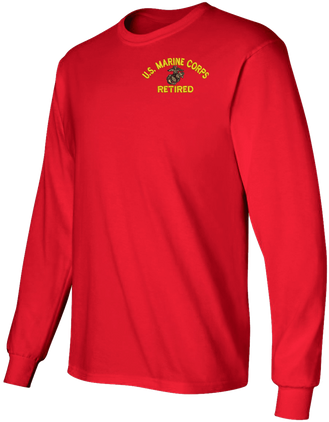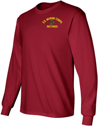 Note: Some of the Color Options pictured may not be available. Available Color Options are listed on the drop down menu above.MilitaryBest has expanded its line of apparel with this custom embroidered U.S. Marine Corps Eagle Globe and Anchor Retired Long Sleeve T-Shirt. This Gildan brand long sleeve t-shirt is made using a 6 oz pre-shrunk 100% cotton material. This U.S. Marine Corps Eagle Globe and Anchor Retired Long Sleeve T-Shirt will make an excellent addition to your wardrobe or a quality gift. This U.S. Marine Corps Eagle Globe and Anchor Retired Long Sleeve T-Shirt is custom embroidered at our facilities in Scottsboro, Alabama.