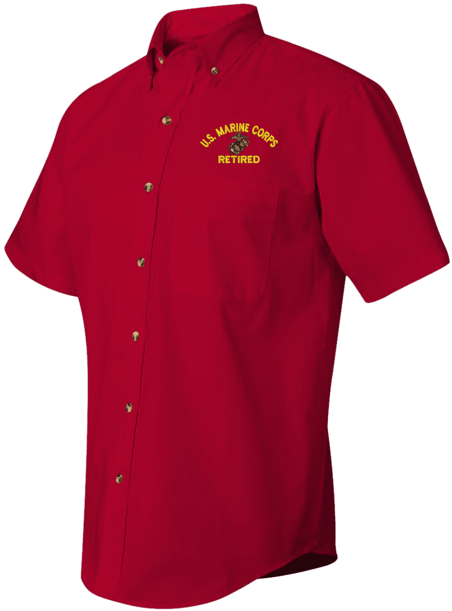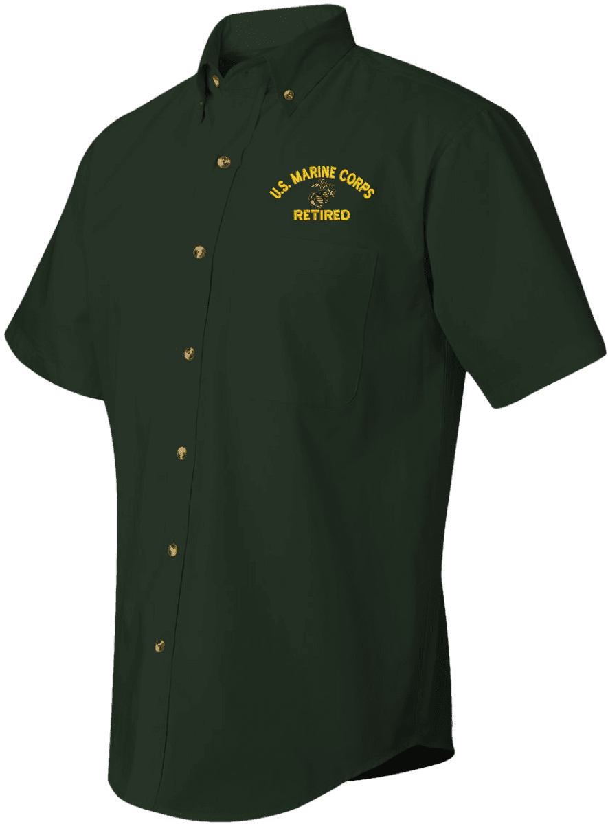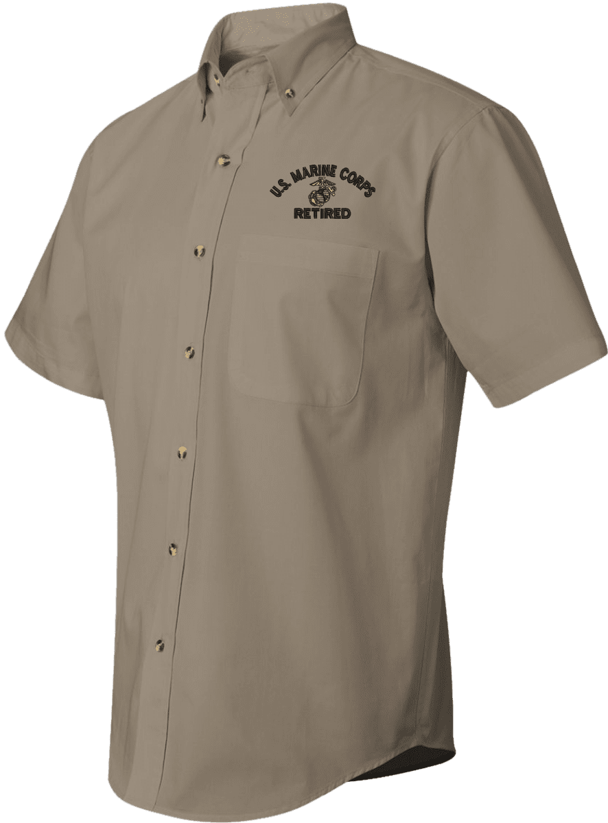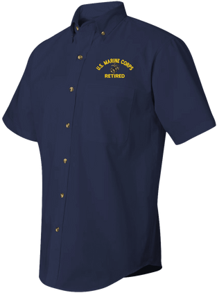 We are selling out of our remaining inventory of this discontinued item at a limited supply.MilitaryBest has expanded its line of apparel with this custom embroidered U.S. Marine Corps Eagle Globe and Anchor Retired Short Sleeve Dress Shirt. This Featherlite brand short sleeve button down dress shirt is made using a stain-resistant 60/40 cotton/polyester twill material. This U.S. Marine Corps Eagle Globe and Anchor Retired Short Sleeve Dress Shirt will make an excellent addition to your wardrobe or a quality gift. This U.S. Marine Corps Eagle Globe and Anchor Retired Short Sleeve Dress Shirt is custom embroidered at our facilities in Scottsboro, Alabama.