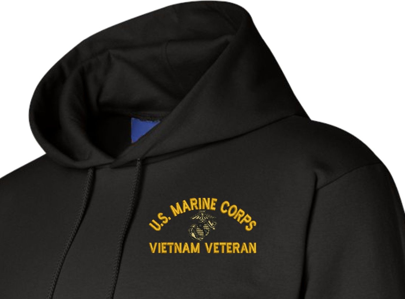MilitaryBest has expanded its line of apparel with this custom embroidered U.S. Marine Corps Eagle Globe and Anchor (EGA) Vietnam Veteran Hoodie. Each Hoodie is direct embroidered onto a Champion brand 9.5 oz 50/50 Cotton Poly blend. This U.S. Marine Corps Eagle Globe and Anchor (EGA) Vietnam Veteran Hoodie will make an excellent addition to your wardrobe, or a great gift. Your satisfaction is Guaranteed! This U.S. Marine Corps Eagle Globe and Anchor (EGA) Vietnam Veteran Hoodie is custom embroidered at our facilities in Scottsboro, AL.
