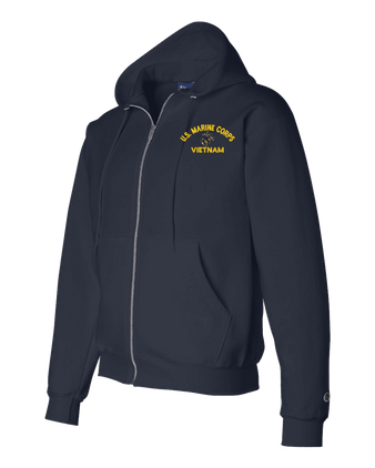 MilitaryBest has expanded its line of apparel with this custom embroidered U.S. Marine Corps Eagle Globe and Anchor (EGA) Vietnam Zippered Hoodie. Each Hoodie is direct embroidered onto a Champion brand 9.5 oz 50/50 Cotton Poly blend. This U.S. Marine Corps Eagle Globe and Anchor (EGA) Vietnam Zippered Hoodie will make an excellent addition to your wardrobe, or a great gift. Your satisfaction is Guaranteed! This U.S. Marine Corps Eagle Globe and Anchor (EGA) Vietnam Zippered Hoodie is custom embroidered at our facilities in Scottsboro, AL.