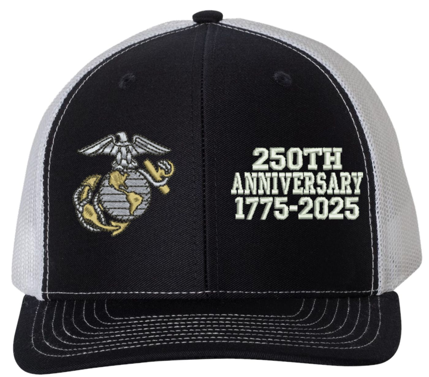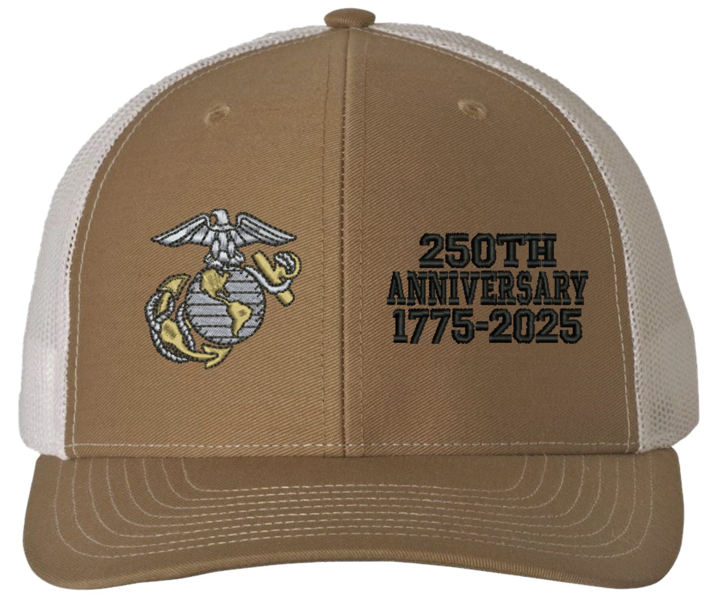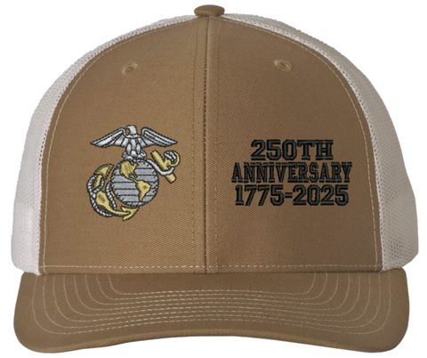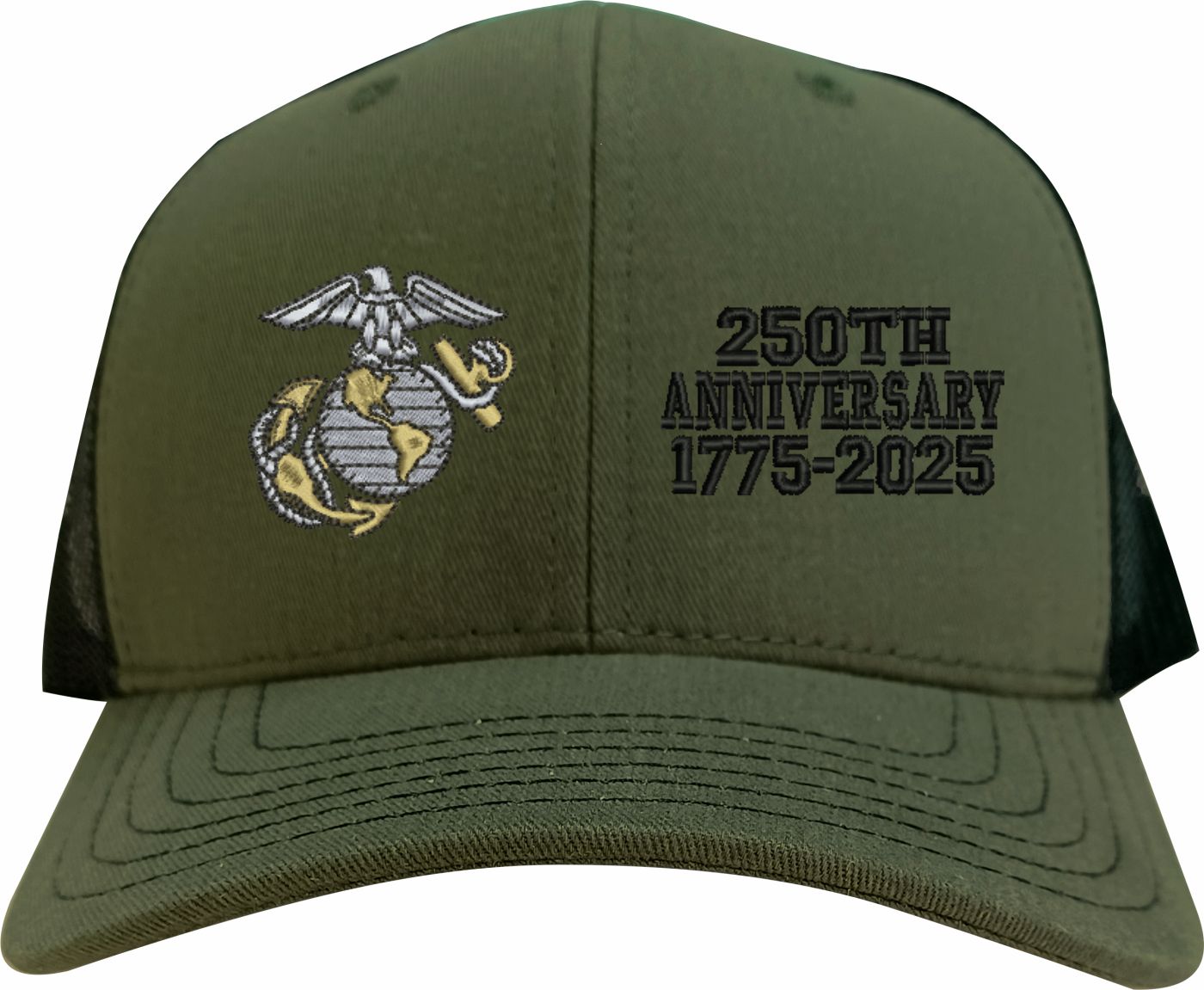 MilitaryBest is proud to offer this U.S. Marine Corps Officer 250th Anniversary Split Design Embroidered Mesh-Back Cap. The design of this Cap has an Insignia on the Left side and Text on the Right side, creating a "split" design. This Mesh-Back Cap is expertly crafted by our skilled embroidery technicians at our facilities in Scottsboro, Alabama. As with all MilitaryBest items, your satisfaction is guaranteed!For caps ordered with custom embroidered personalized text please allow an additional 3 to 5 days production time. All custom back text will be embroidered in ALL CAPITAL LETTERS. Caps with back text or eggs are non-returnable unless there is a material defect in the cap.