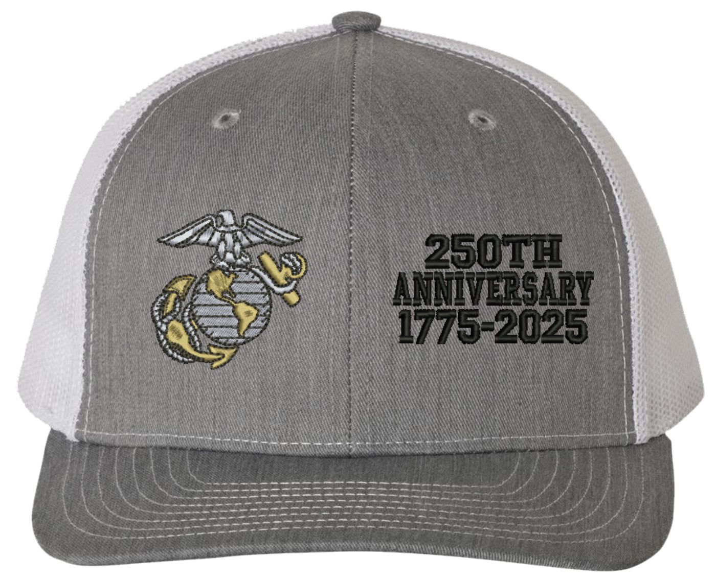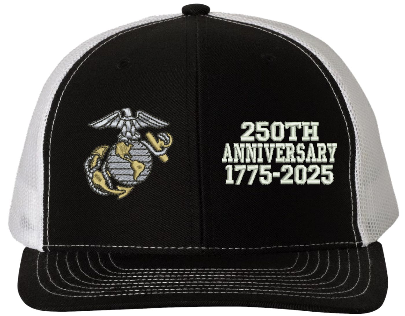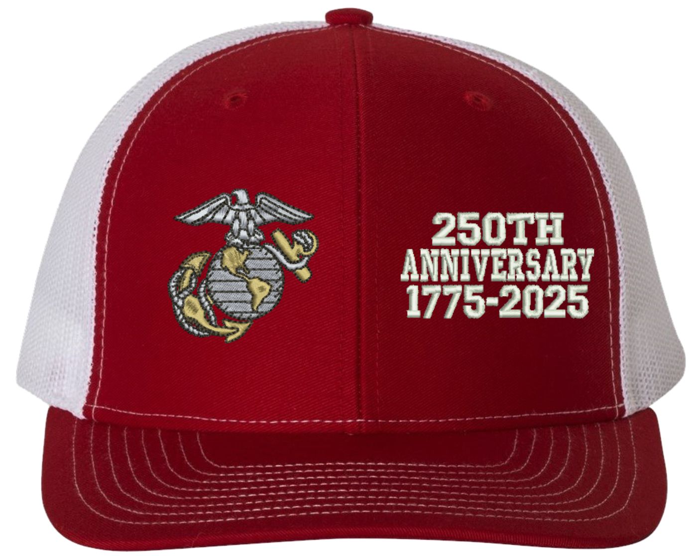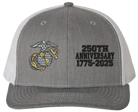 MilitaryBest is proud to offer this U.S. Marine Corps Officer 250th Anniversary Split Design Embroidered Mesh-Back Cap. The design of this Cap has an Insignia on the Left side and Text on the Right side, creating a "split" design. This Mesh-Back Cap is expertly crafted by our skilled embroidery technicians at our facilities in Scottsboro, Alabama. As with all MilitaryBest items, your satisfaction is guaranteed!For caps ordered with custom embroidered personalized text please allow an additional 3 to 5 days production time. All custom back text will be embroidered in ALL CAPITAL LETTERS. Caps with back text or eggs are non-returnable unless there is a material defect in the cap.