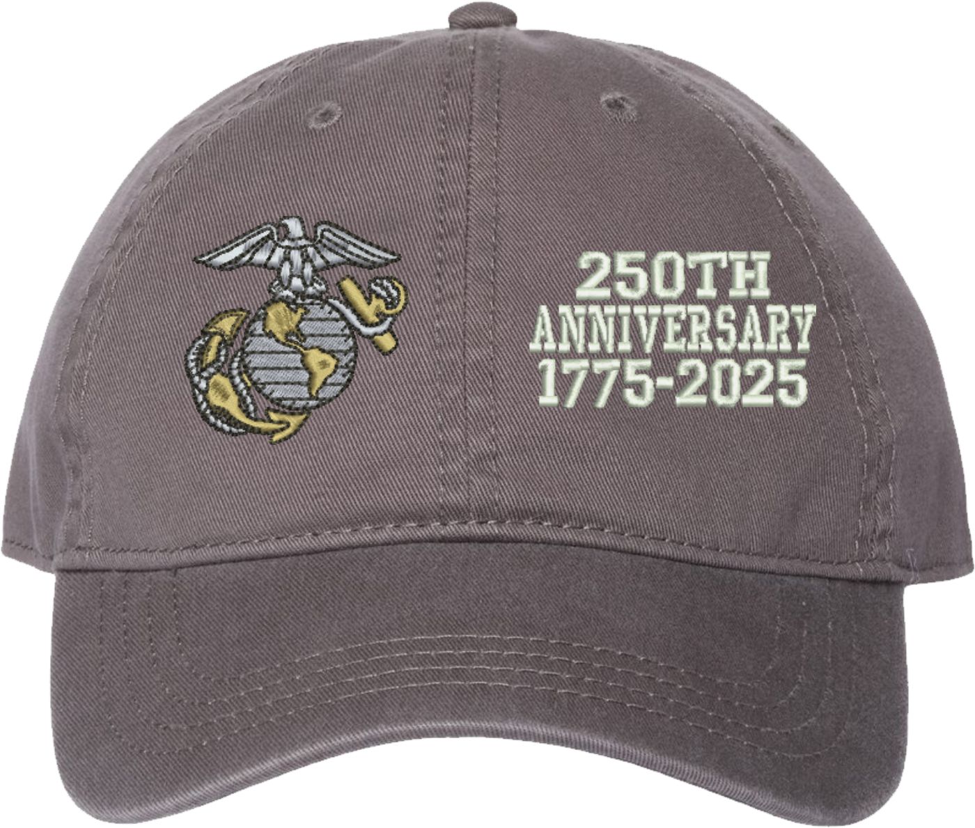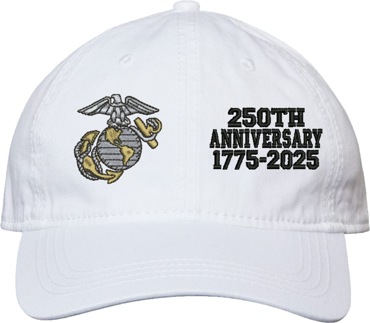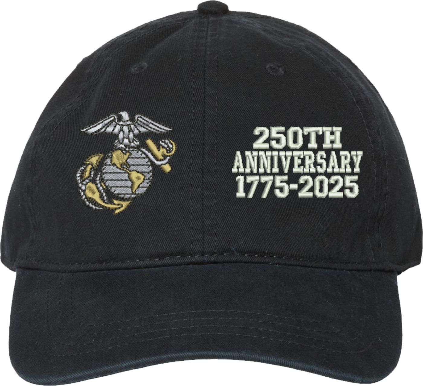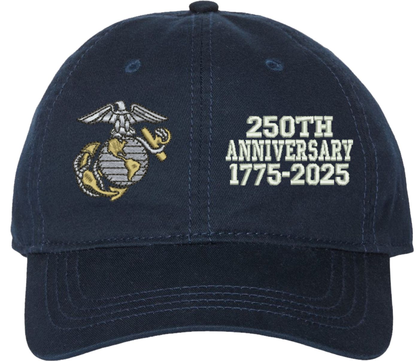 Show your Marine Corps pride with this U.S. Marine Corps Officer 250th Anniversary Split Design Unstructured Dad Cap from MilitaryBest. Crafted from 100% washed chino twill cotton, this six-panel, low-profile cap offers a relaxed and comfortable fit. Featuring high-quality embroidery done in our Scottsboro, Alabama facility, this cap is designed with a pre-curved visor and an adjustable tri-glide buckle closure for a perfect fit. Whether for everyday wear or as a meaningful gift, this cap is a great way to honor your own or a loved one's service.If a ribbon stack is chosen as the insignia, side of insignia text can not be embroidered. For caps ordered with custom embroidered personalized text please allow an additional 3 to 5 days production time. All custom back text will be embroidered in ALL CAPITAL LETTERS. Caps with back text or eggs are non-returnable unless there is a material defect in the cap.
