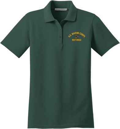 MilitaryBest is proud to offer this U.S. Marine Corps Retired Women's Stain-Release Polo. This polo is embroidered by our MilitaryBest team in Northeast Alabama. These polos are made with a stain-release finish for long-lasting wear, odor-fighting properties, and superior wrinkle and shrink resistance.Care Instructions: Machine Wash Cold With Like Colors. Do Not Use Fabric Softener. Do Not Bleach. Tumble Dry Low. Warm Iron If Necessary.