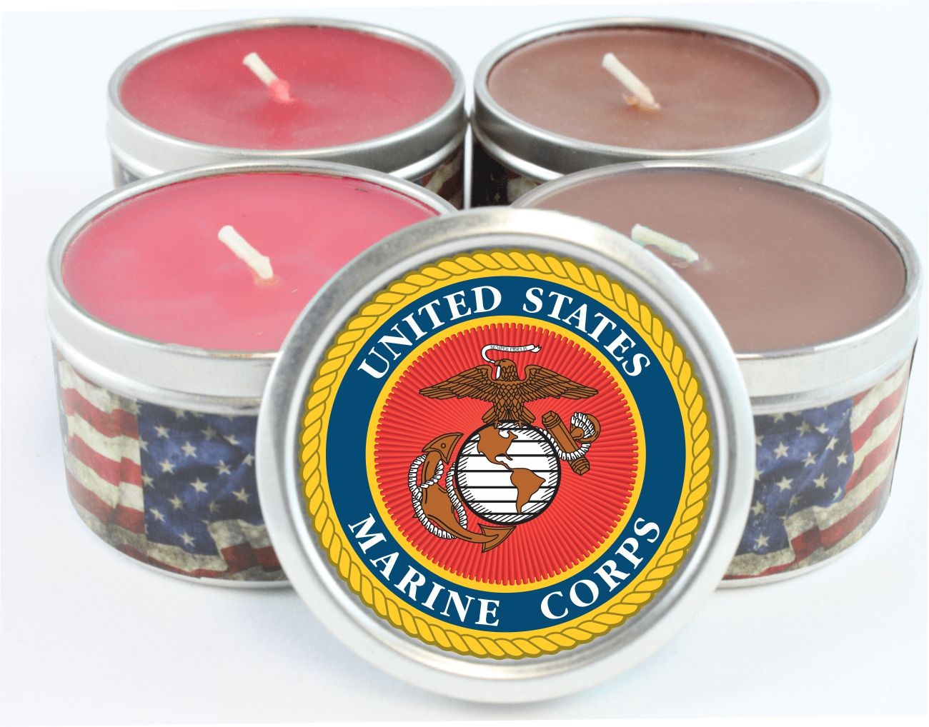 MilitaryBest is proud to offer this selection of U.S. Marine Corps Emblem Scented Candles. Each candle features an American flag banner wrapped around the base with the U.S.M.C emblem on the lid. These candles are manufactured with a custom mix of blended scents and paraffin wax of maximum purity and utilize zinc-cored wicks for cool, extended burning. The 4 Ounce candles have a burn time of 22-26 hours and the 8 Ounce candles have a burn time of 48 hours. These U.S.M.C Scented Candles are made in the USA and their quality is guaranteed!