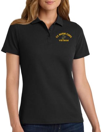 MilitaryBest is proud to offer this U.S. Marine Corps Vietnam Women's Stain-Release Polo. This polo is embroidered by our MilitaryBest team in Northeast Alabama. These polos are made with a stain-release finish for long-lasting wear, odor-fighting properties, and superior wrinkle and shrink resistance.Care Instructions: Machine Wash Cold With Like Colors. Do Not Use Fabric Softener. Do Not Bleach. Tumble Dry Low. Warm Iron If Necessary.