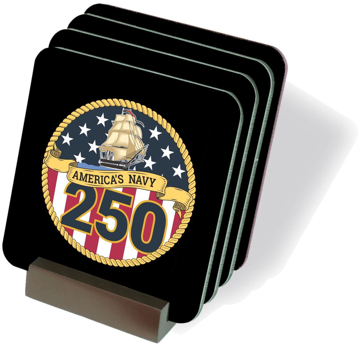 These U.S. Navy 250th Anniversary Coasters are proudly made in the USA and their quality is guaranteed! Each of our military drink coasters measure 3 ¾”, has a beautiful gloss finish and is manufactured with a soft cork underside to protect your furniture and prevent slipping. This set of coasters is accompanied by a handsome wood coaster holder display rack as shown in our picture above. We are proud to offer these U.S. Navy drink coasters and hope that you’ll enjoy them for years to come. Purchase for yourself or as a Military Gift for a friend or loved one.A percentage of the sale of each MilitaryBest item is forwarded to the licensing departments of each respective branch of service in support of the MWR (Morale, Welfare, & Recreation) program. These payments are made by either ALL4U LLC or the wholesaler from where the item originated. Our team thanks you for your service and your support of these programs.
