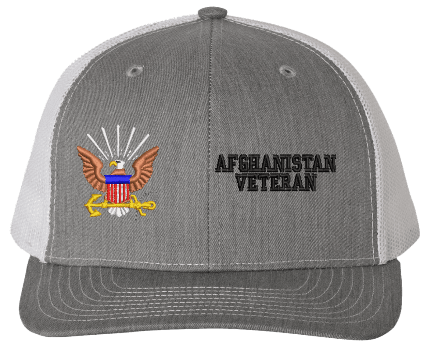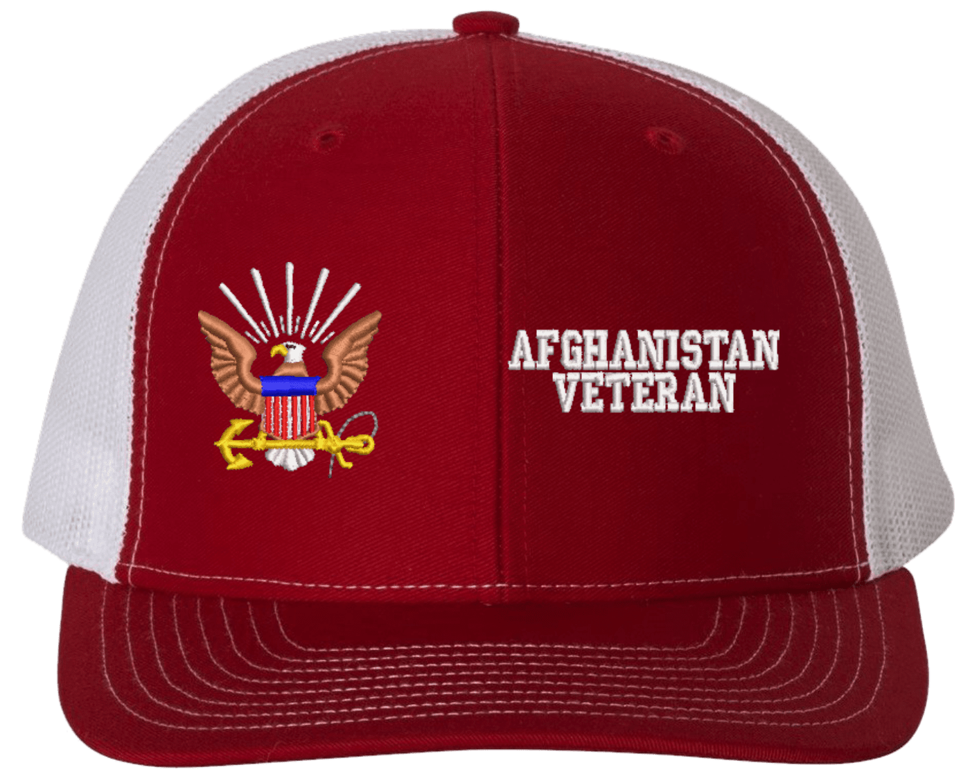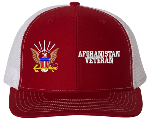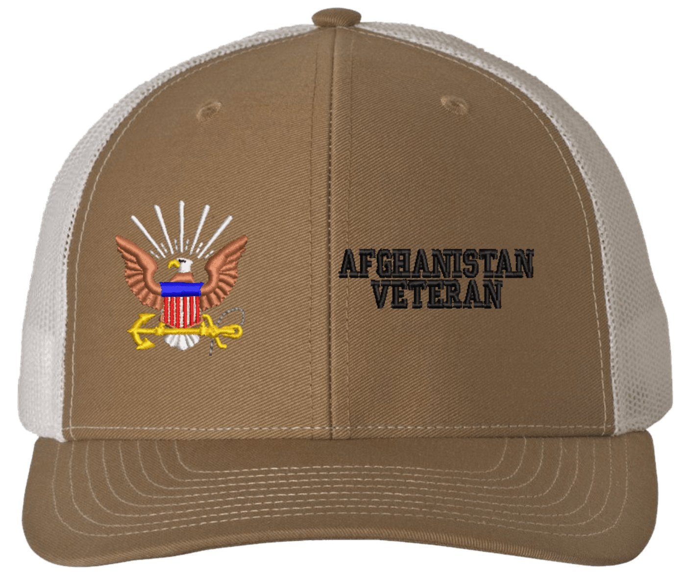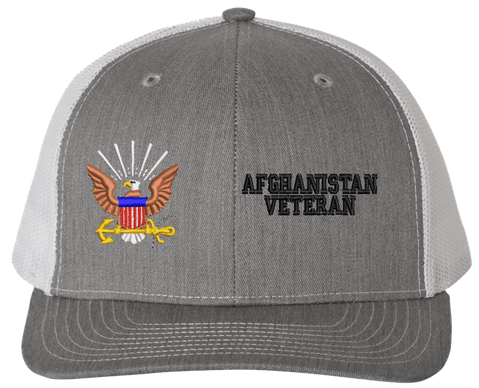 MilitaryBest is proud to offer this U.S. Navy Afghanistan Veteran Mesh Back Cap. The design of this U.S. Navy Cap is crisp, clean, and sure to be loved by people of all ages! Select above from our many cap colors. This U.S. Navy Afghanistan Veteran Mesh Back Cap is crafted by our skilled embroidery technicians at our facilities in Scottsboro, AL. As with all MilitaryBest items, your satisfaction is guaranteed!Caps ordered with custom embroidered personalized back text require an additional 2 to 3 days production time. All custom back text will be embroidered in ALL CAPITAL LETTERS. Caps personalized with back text are non-returnable unless there is a material defect in the cap.