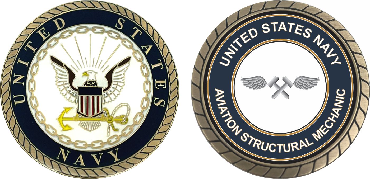 This 1 3/4” U.S. Navy Aviation Structural Mechanic AM Challenge Coin is proudly offered by MilitaryBest. This Officially Licensed Navy coin has beautiful enamel finish on one side and an organized crisp clean Aviation Structural Mechanic AM design on the opposite side.