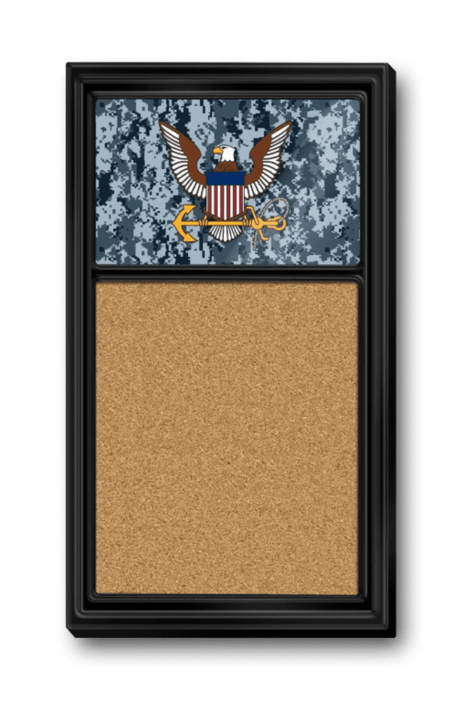 US Navy: Camo - Cork Note BoardThe United States Navy Cork Note Board is perfect for keeping notes and pinning messages or photos in any fan cave, game room, office or dorm. Our note board wall sign is injection molded with it's high-resolution digitally printed face, high gloss finish, and Corkboard surface, it will provide hours of use while adding a finishing touch to any room. Mounting hardware included. This is an officially licensed product of the Navy and made in the USA.
