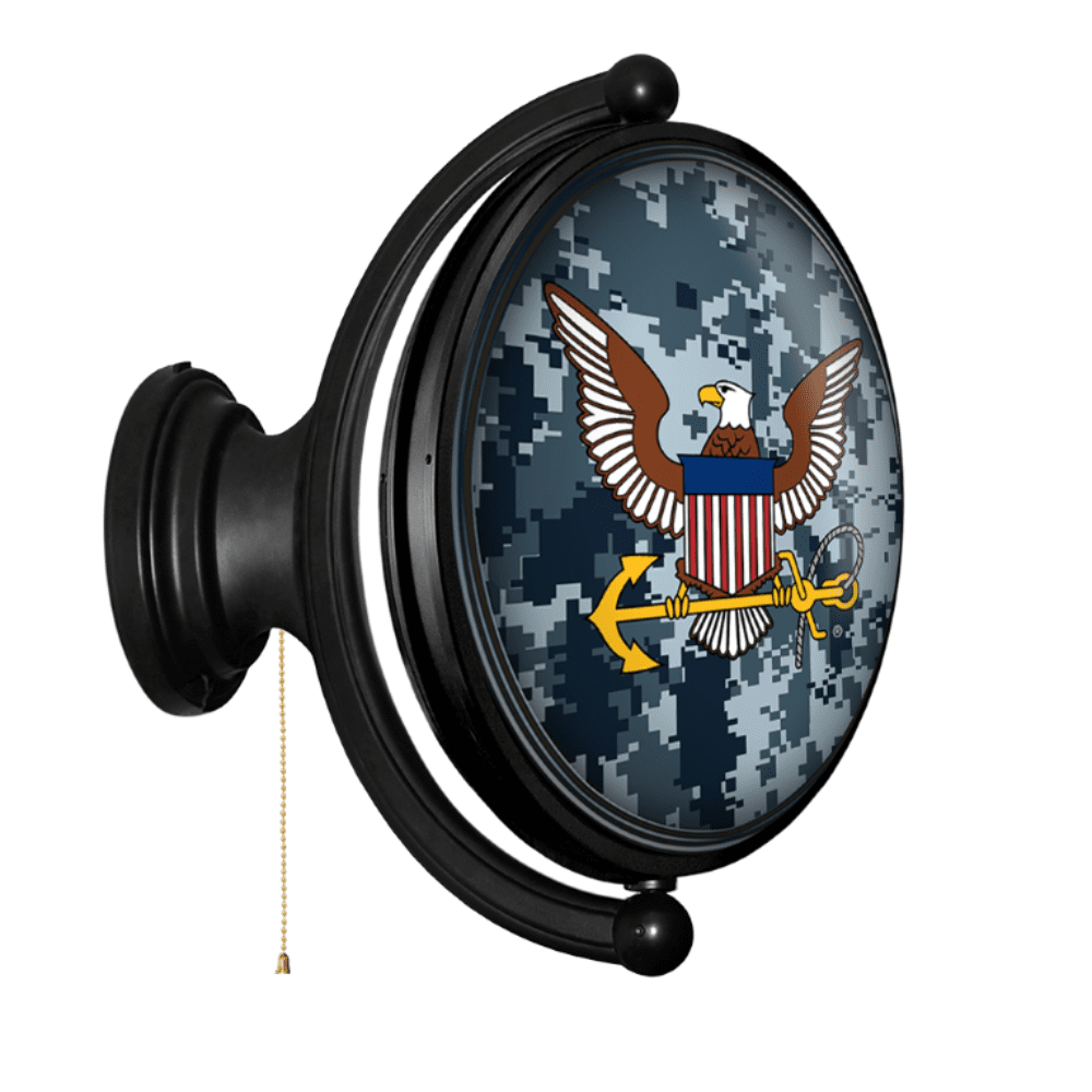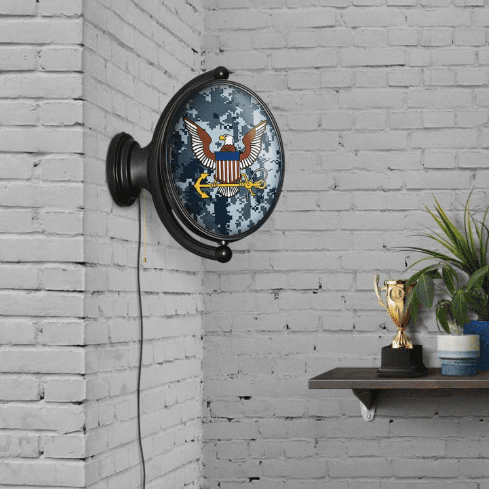 US Navy: Camo - Original Oval Illuminated Rotating Wall SignThe Original United States Navy Rotating Lighted Wall Sign both lights up and spins while allowing you to displaying your dedication for the Navy. Whether it's your fan cave, office, game room, or garage, this decorative sign is the perfect addition to any wall. It showcases the latest in LED technology and only uses 12 watts of power. Injection molded, it comes with an 8ft. power cord and a metal pull chain. Mounting hardware included and installation takes no more than 10 minutes. This is an officially licensed product of the Navy and made in the USA.