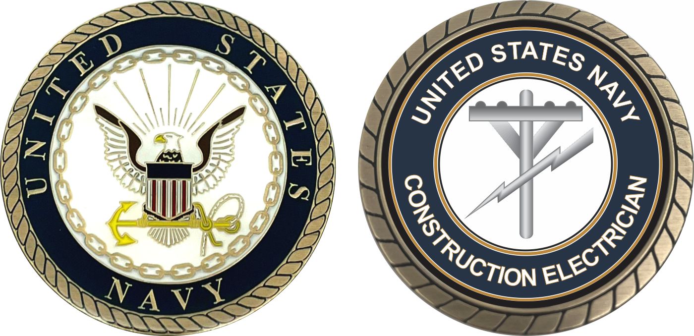 This 1 3/4” U.S. Navy Construction Electrician CE Challenge Coin is proudly offered by MilitaryBest. This Officially Licensed Navy coin has beautiful enamel finish on one side and an organized crisp clean Construction Electrician CE design on the opposite side.