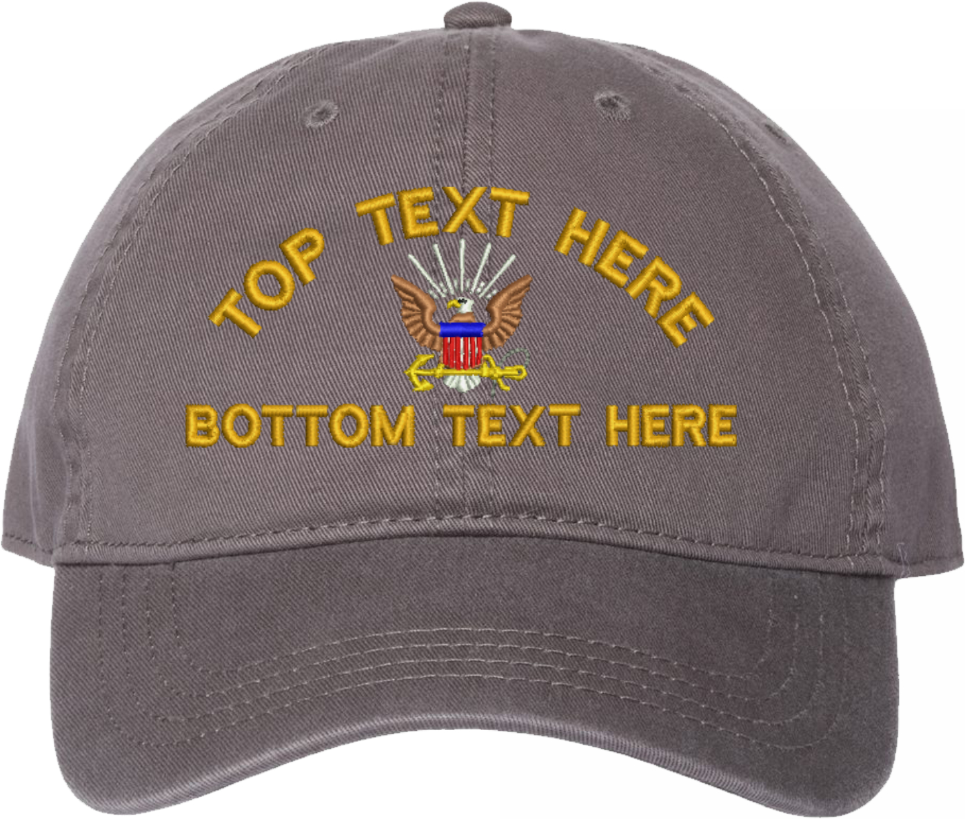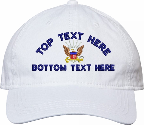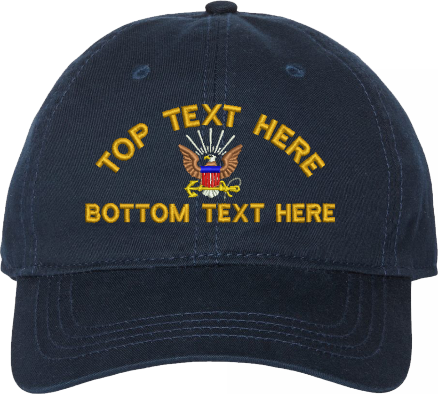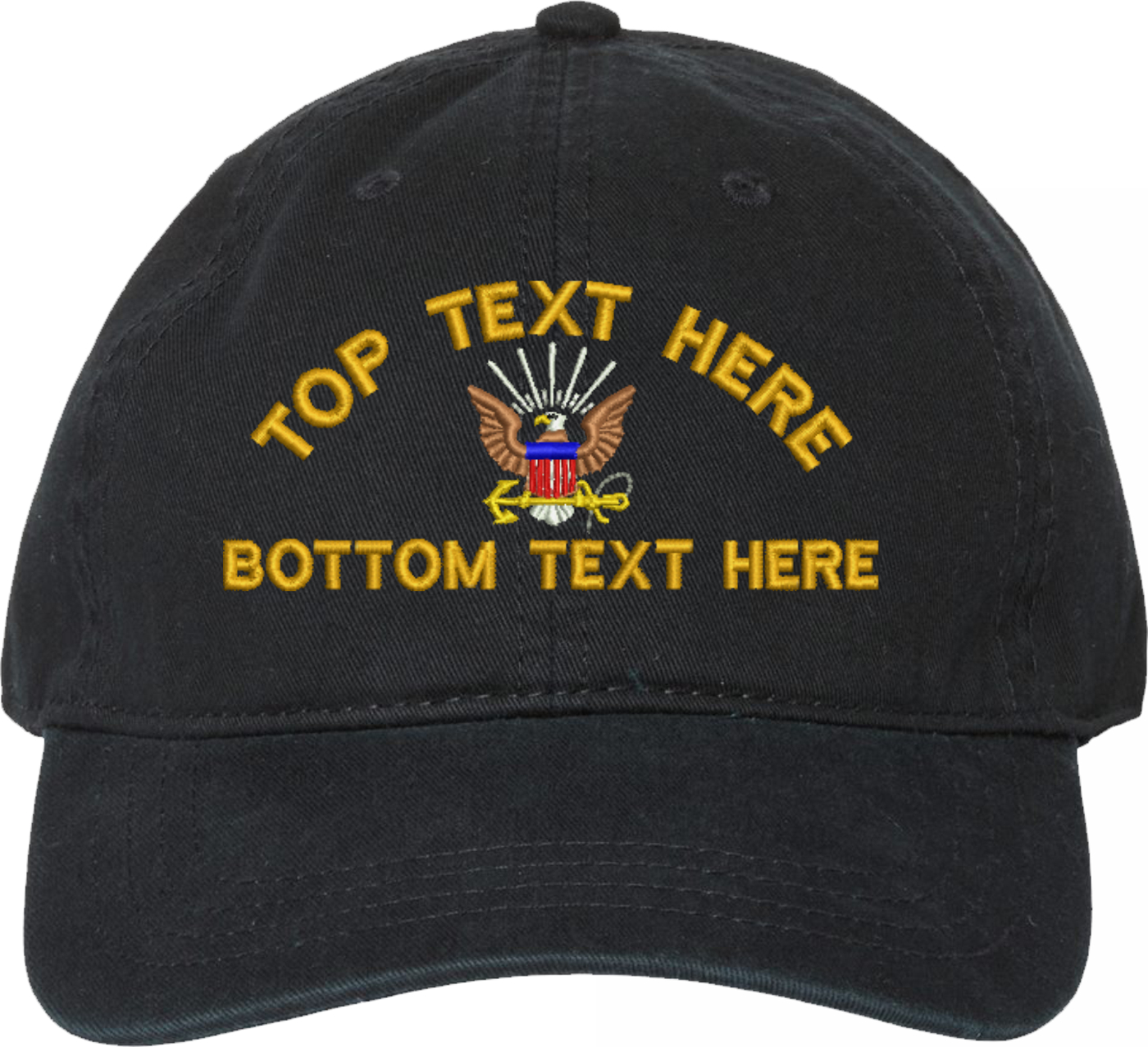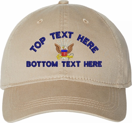 Show your Navy pride with this U.S. Navy Custom Unstructured Dad Cap from MilitaryBest. Also known as an "Old Salt" Cap, This hat was crafted from 100% washed chino twill cotton, this six-panel, low-profile cap offers a relaxed and comfortable fit. Featuring high-quality embroidery done in our Scottsboro, Alabama facility, this cap is designed with a pre-curved visor and an adjustable tri-glide buckle closure for a perfect fit. Whether for everyday wear or as a meaningful gift, this cap is a great way to honor your own or a loved one's service.If a ribbon stack is chosen as the insignia, side of insignia text can not be embroidered. For caps ordered with custom embroidered personalized text please allow an additional 3 to 5 days production time. All custom back text will be embroidered in ALL CAPITAL LETTERS. Caps with back text or eggs are non-returnable unless there is a material defect in the cap.