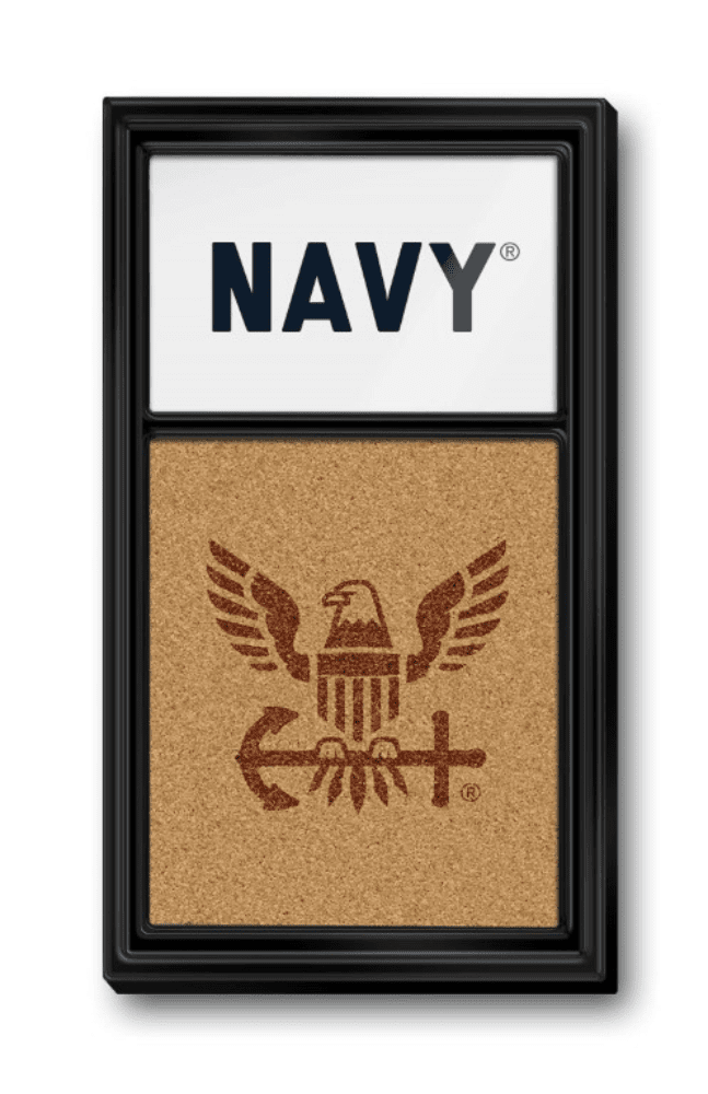 The United States Navy Cork Note Board is perfect for keeping notes and pinning messages or photos in any fan cave, game room, office or dorm. Our note board wall sign is injection molded with it's high-resolution digitally printed face, high gloss finish, and Corkboard surface, it will provide hours of use while adding a finishing touch to any room. Mounting hardware included. This is an officially licensed product of the Navy and made in the USA.FEATURES
