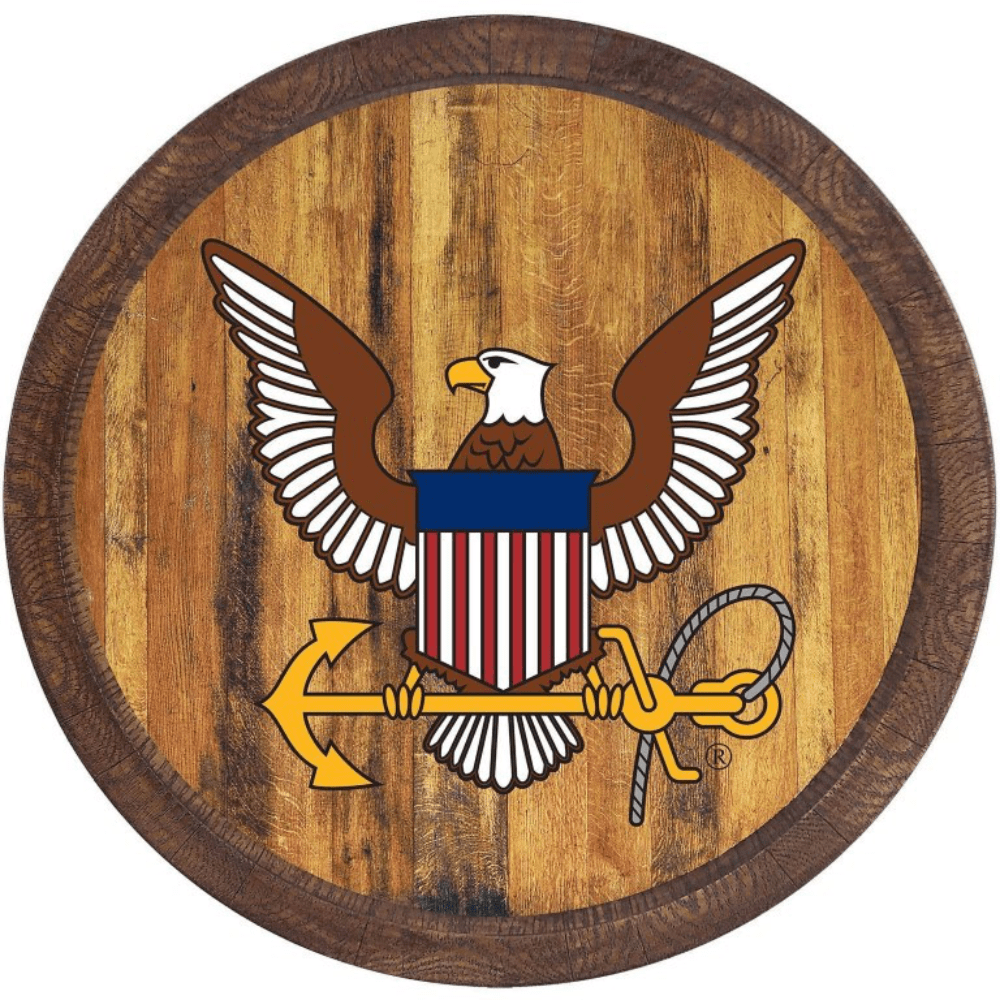 Our United States Navy Barrel Top Wall Sign is an affordable, durable, and easy to hang option for those who have always wanted a barrel top sign. This product is injection molded and hand stained to give it an authentic wood look. It is printed with automotive grade UV stable inks and given a high gloss finish. Bring the rustic look indoors with this great piece of wall decor that will bring style to any room of the home or office. This is an officially licensed product of the Navy and made in the USA.FEATURES