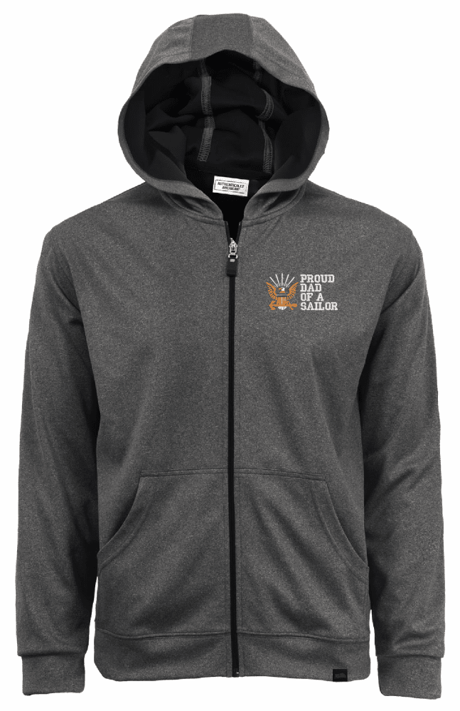 MilitaryBest proudly offers this top-quality Proud Dad of a Sailor U.S. Navy Men's 100% Polyester Heather Grey Full-Zip Hoodie. We have proudly partnered with Authentically American to offer you this Made in the USA Hoodie. Water & wrinkle resistance make this zip hoodie the perfect layering piece from the golf course to you favorite travel destination.As with all MilitaryBest items, our designs are Officially Licensed. A percentage of the sale of each MilitaryBest item is forwarded to the licensing department in support of it's MWR (Morale, Welfare, & Recreation) program. These payments are made by either ALL4U LLC or the wholesaler from where the item originated. Our team thanks you for your service and your support of these programs.