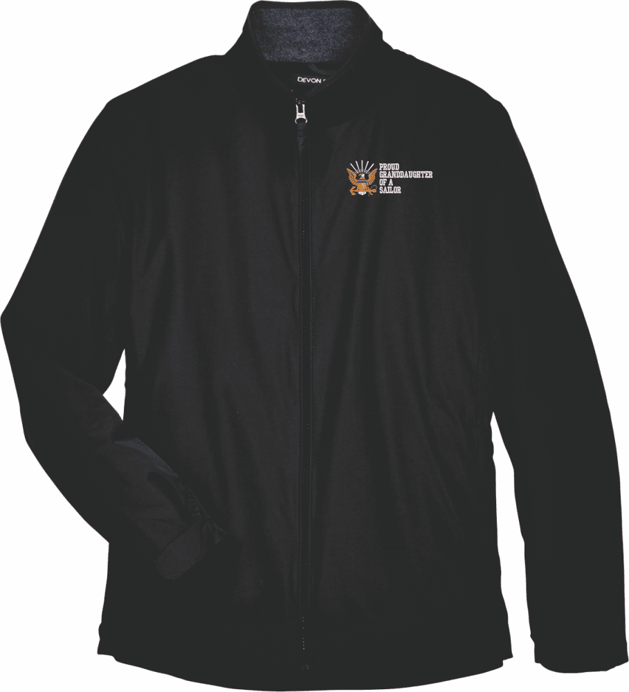 MilitaryBest is proud to offer this U.S. Navy Emblem Proud Granddaughter of a Sailor Women's Devon & Jones Jacket. Each ladies three season jacket is made from a 3-Layer system consisting of a nylon shell, an insulator layer, Nylon-lined sleeves, and an inside layer of fleece for comfort. Each jacket’s features include a sturdy black enamel front-zipper, raglan sleeves, outsize zip pockets, an inside zip security pocket, YKK zippers, and a banded-bottom. As with all MilitaryBest products, your satisfaction is guaranteed!| S | M | L | XL | 2XL | |