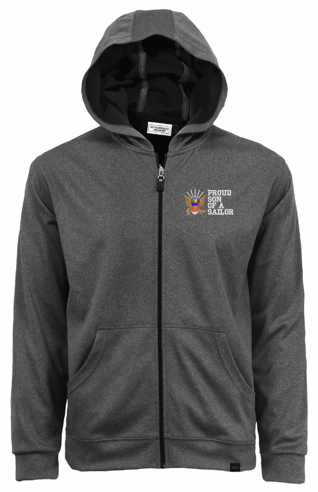 MilitaryBest proudly offers this top-quality Proud Son of a Sailor U.S. Navy Men's 100% Polyester Heather Grey Full-Zip Hoodie. We have proudly partnered with Authentically American to offer you this Made in the USA Hoodie. Water & wrinkle resistance make this zip hoodie the perfect layering piece from the golf course to you favorite travel destination.As with all MilitaryBest items, our designs are Officially Licensed. A percentage of the sale of each MilitaryBest item is forwarded to the licensing department in support of it's MWR (Morale, Welfare, & Recreation) program. These payments are made by either ALL4U LLC or the wholesaler from where the item originated. Our team thanks you for your service and your support of these programs.