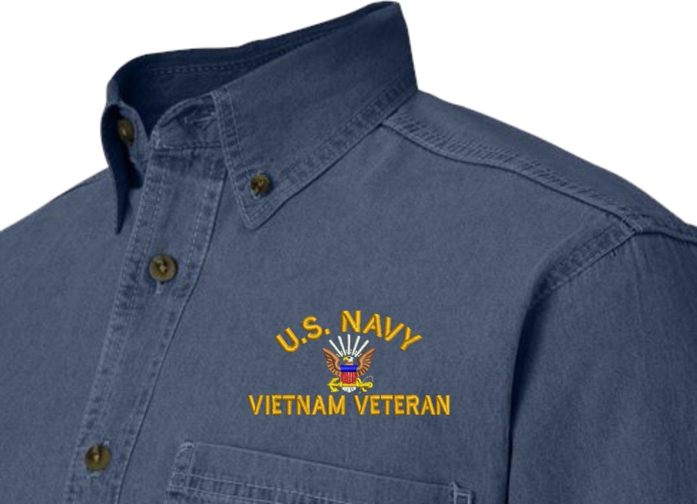 Note: Some of the Color Options pictured may not be available. Available Color Options are listed on the drop down menu above.MilitaryBest has expanded its line of apparel with this custom embroidered U.S. Navy Vietnam Veteran Denim Shirt. This long sleeve button down denim shirt is made using a 100% cotton denim material. This U.S. Navy Vietnam Veteran Denim Shirt will make an excellent addition to your wardrobe or a quality gift. This U.S. Navy Vietnam Veteran Denim Shirt is custom embroidered at our facilities in Scottsboro, Alabama.