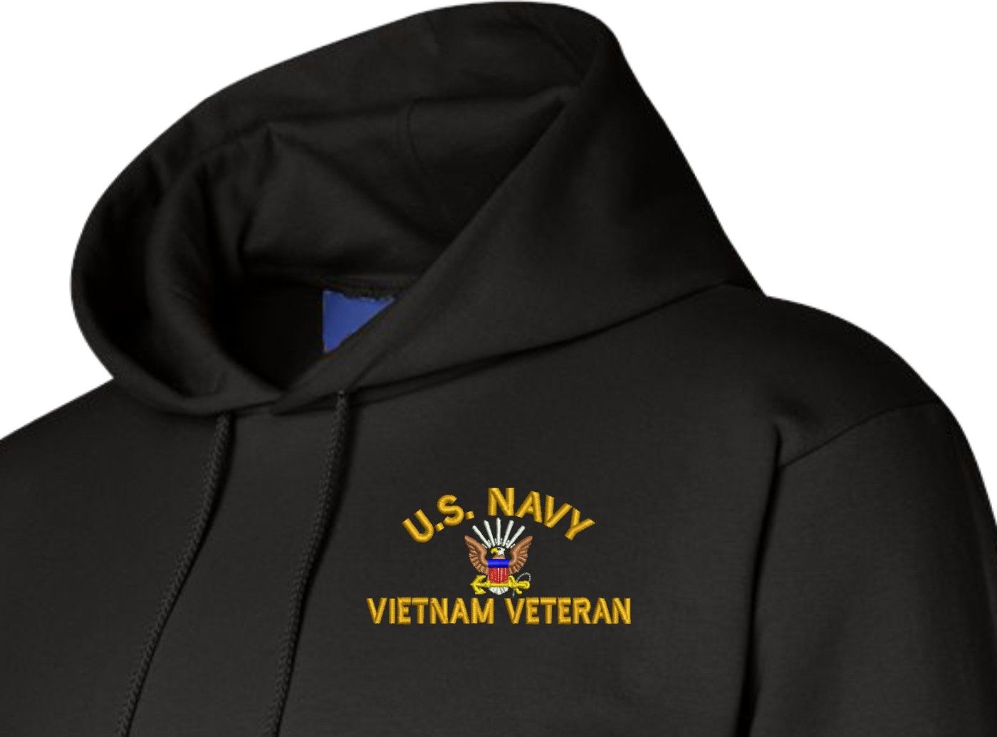 MilitaryBest has expanded its line of apparel with this custom embroidered U.S. Navy Vietnam Veteran Hoodie. Each Hoodie is direct embroidered onto a Champion brand 9.5 oz 50/50 Cotton Poly blend. This U.S. Navy Vietnam Veteran Hoodie will make an excellent addition to your wardrobe, or a great gift. Your satisfaction is Guaranteed! This U.S. Navy Vietnam Veteran Hoodie is custom embroidered at our facilities in Scottsboro, AL.