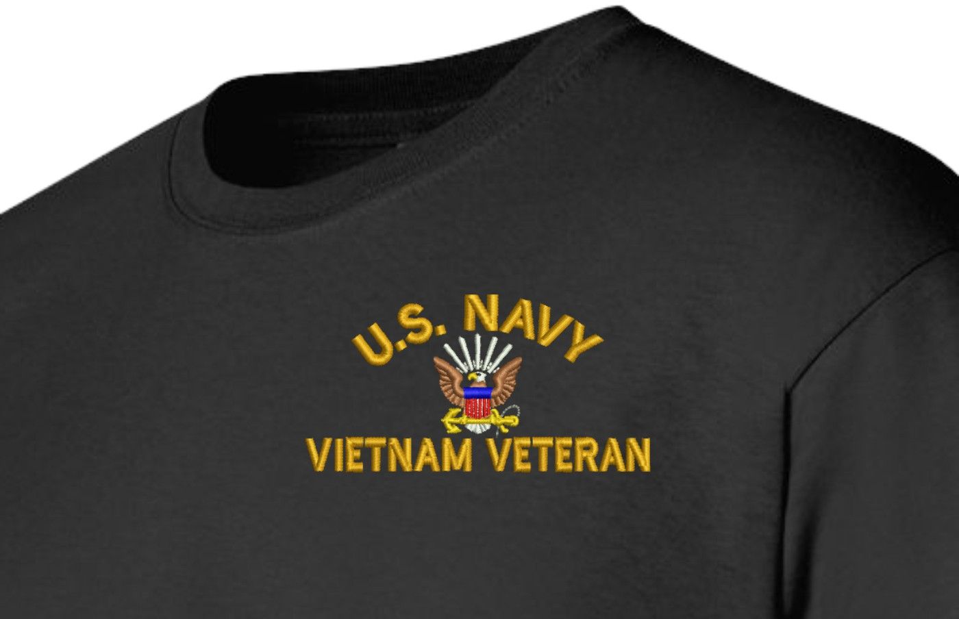 Note: Some of the Color Options pictured may not be available. Available Color Options are listed on the drop down menu above.MilitaryBest has expanded its line of apparel with this custom embroidered U.S. Navy Vietnam Veteran Long Sleeve T-Shirt. This Gildan brand long sleeve t-shirt is made using a 6 oz pre-shrunk 100% cotton material. This U.S. Navy Vietnam Veteran Long Sleeve T-Shirt will make an excellent addition to your wardrobe or a quality gift. This U.S. Navy Vietnam Veteran Long Sleeve T-Shirt is custom embroidered at our facilities in Scottsboro, Alabama.