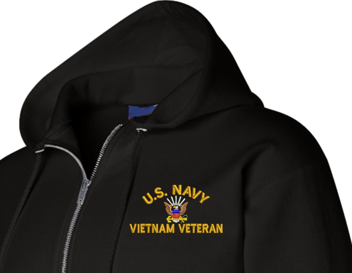 MilitaryBest has expanded its line of apparel with this custom embroidered U.S. Navy Vietnam Veteran Zippered Hoodie. Each Hoodie is direct embroidered onto a Champion brand 9.5 oz 50/50 Cotton Poly blend. This U.S. Navy Vietnam Veteran Zippered Hoodie will make an excellent addition to your wardrobe, or a great gift. Your satisfaction is Guaranteed! This U.S. Navy Vietnam Veteran Zippered Hoodie is custom embroidered at our facilities in Scottsboro, AL.