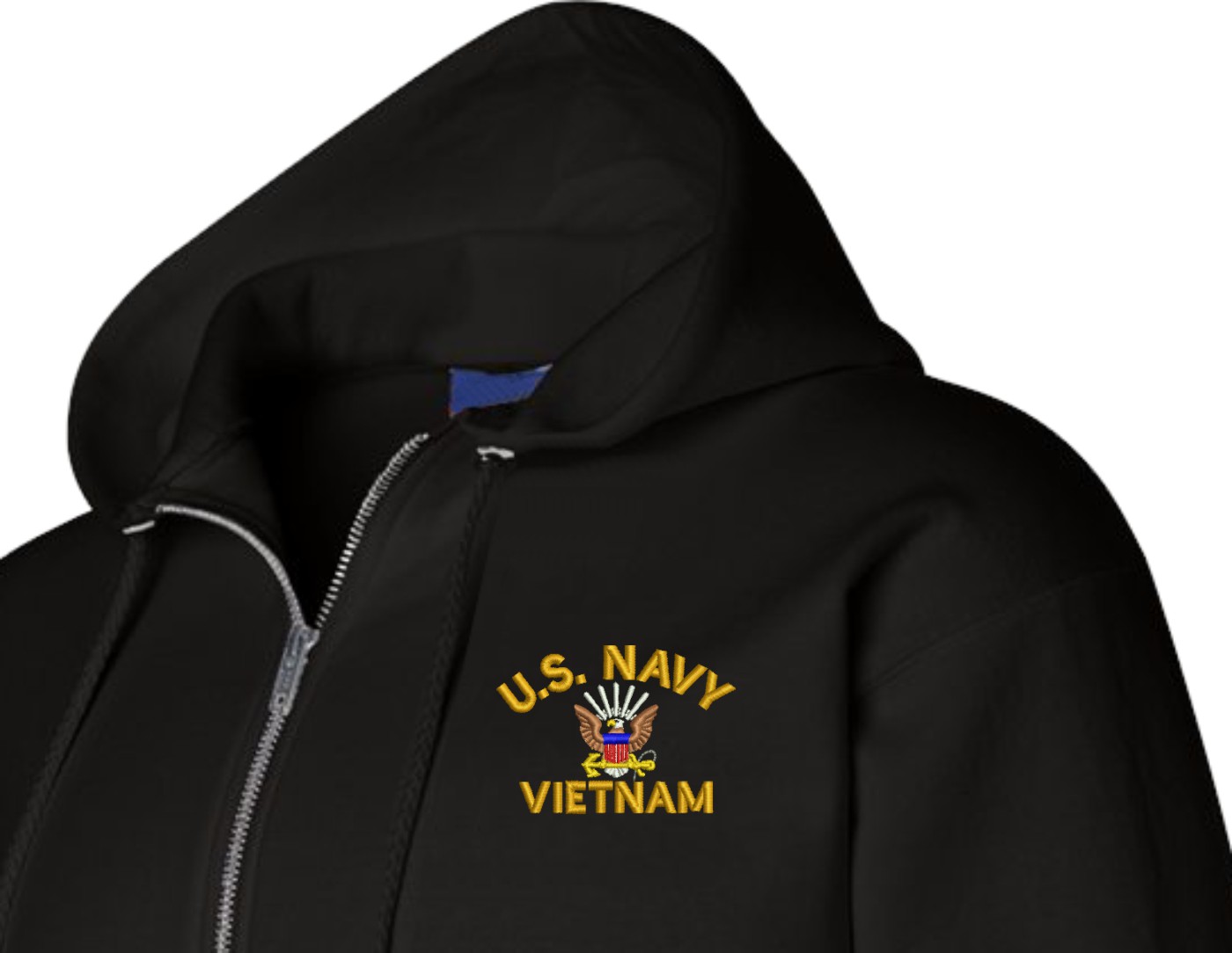 MilitaryBest has expanded its line of apparel with this custom embroidered U.S. Navy Vietnam Zippered Hoodie. Each Hoodie is direct embroidered onto a Champion brand 9.5 oz 50/50 Cotton Poly blend. This U.S. Navy Vietnam Zippered Hoodie will make an excellent addition to your wardrobe, or a great gift. Your satisfaction is Guaranteed! This U.S. Navy Vietnam Zippered Hoodie is custom embroidered at our facilities in Scottsboro, AL.