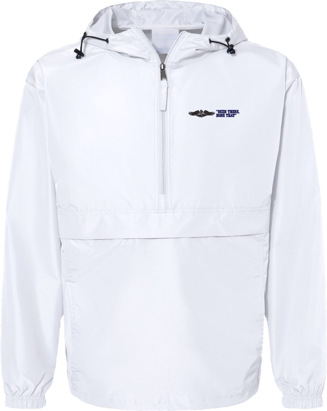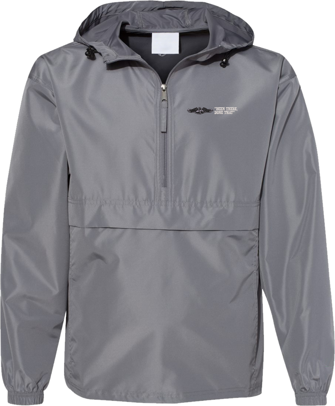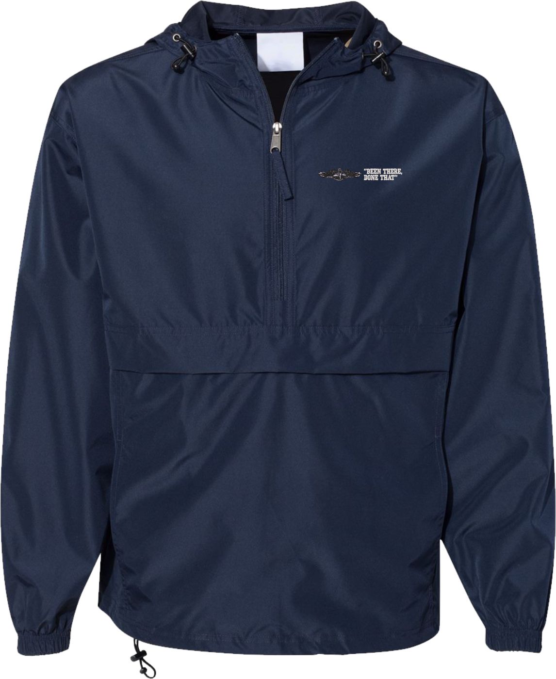MilitaryBest is proud to offer this quality U.S. Navy Enlisted Silver Dolphins Been There Done That Hooded Windbreaker. Also known as an Anorak Jacket, this windbreaker is designed to keep wind and water out. With a design embroidered over the left chest, this windbreaker is embroidered to order at our facilities in Scottsboro, AL.. This windbreaker can be packed into the mesh lined pouch pocket for a more portable method of storage.- 100% Polyester