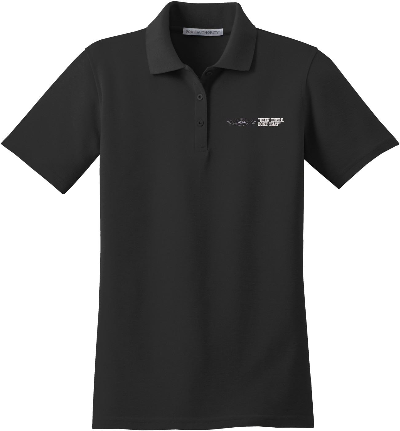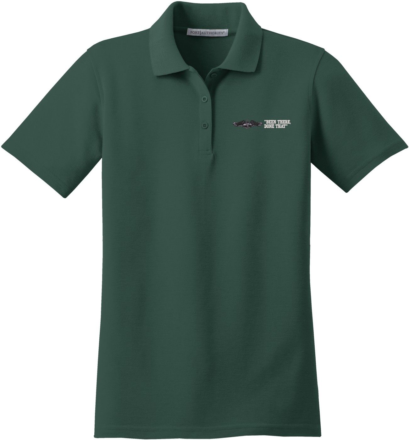 MilitaryBest is proud to offer this U.S. Navy Enlisted Silver Dolphins Been There Done That Women's Stain-Release Polo. This polo is embroidered by our MilitaryBest team in Northeast Alabama. These polos are made with a stain-release finish for long-lasting wear, odor-fighting properties, and superior wrinkle and shrink resistance.Care Instructions: Machine Wash Cold With Like Colors. Do Not Use Fabric Softener. Do Not Bleach. Tumble Dry Low. Warm Iron If Necessary.
