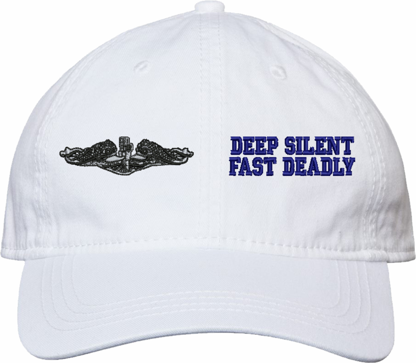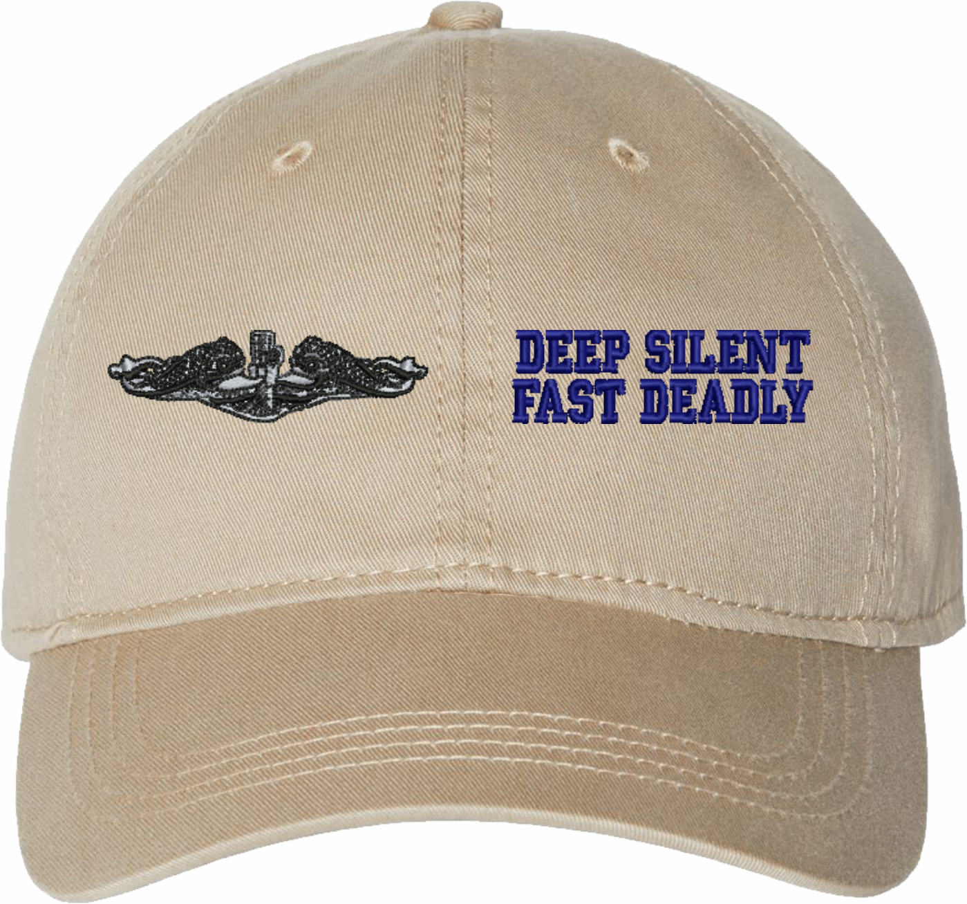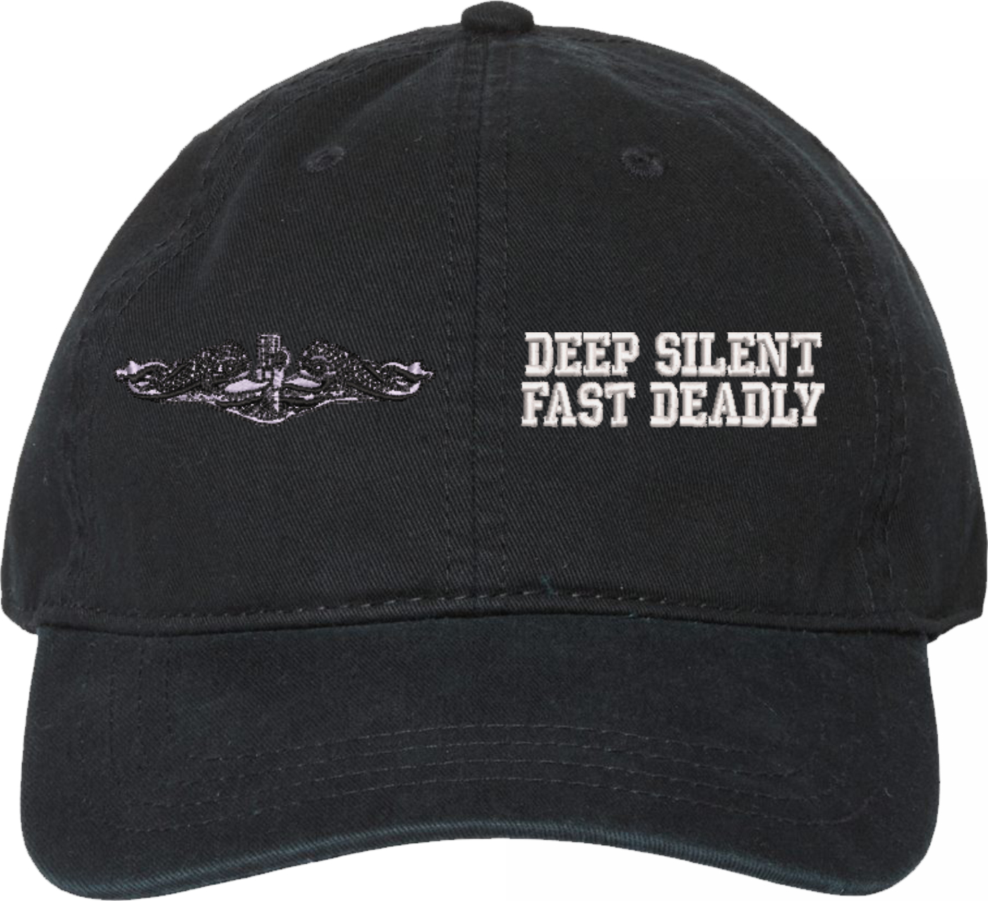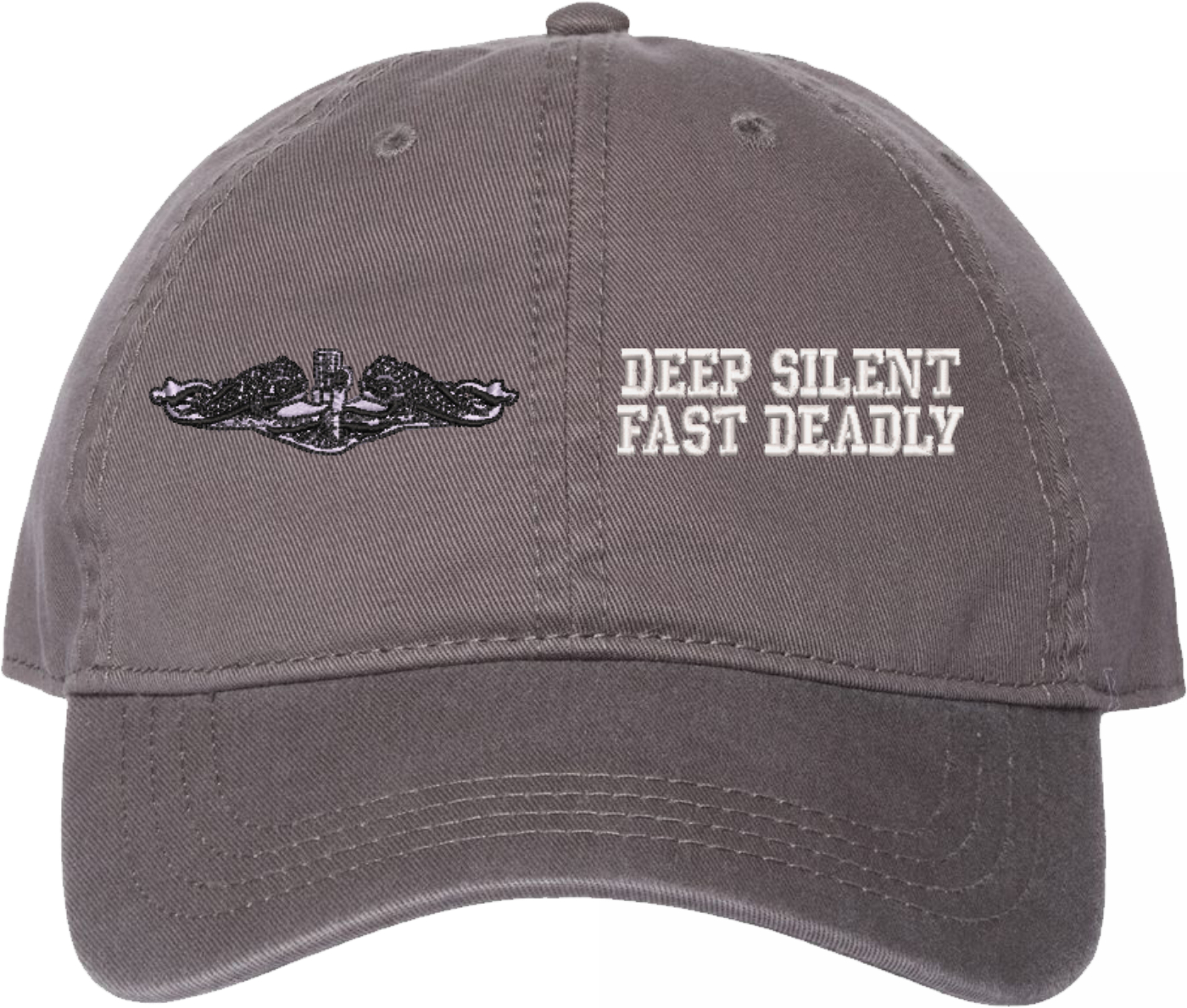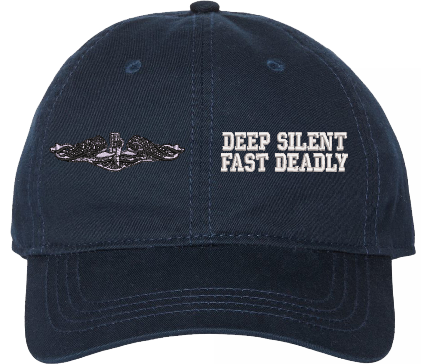 Show your Navy pride with this U.S. Navy Enlisted Silver Dolphins Deep Silent Fast Deadly Unstructured Dad Cap from MilitaryBest. Crafted from 100% washed chino twill cotton, this six-panel, low-profile cap offers a relaxed and comfortable fit. Featuring high-quality embroidery done in our Scottsboro, Alabama facility, this cap is designed with a pre-curved visor and an adjustable tri-glide buckle closure for a perfect fit. Whether for everyday wear or as a meaningful gift, this cap is a great way to honor your own or a loved one's service.For caps ordered with custom embroidered personalized text please allow an additional 3 to 5 days production time. All custom back text will be embroidered in ALL CAPITAL LETTERS. Caps with back text or eggs are non-returnable unless there is a material defect in the cap.