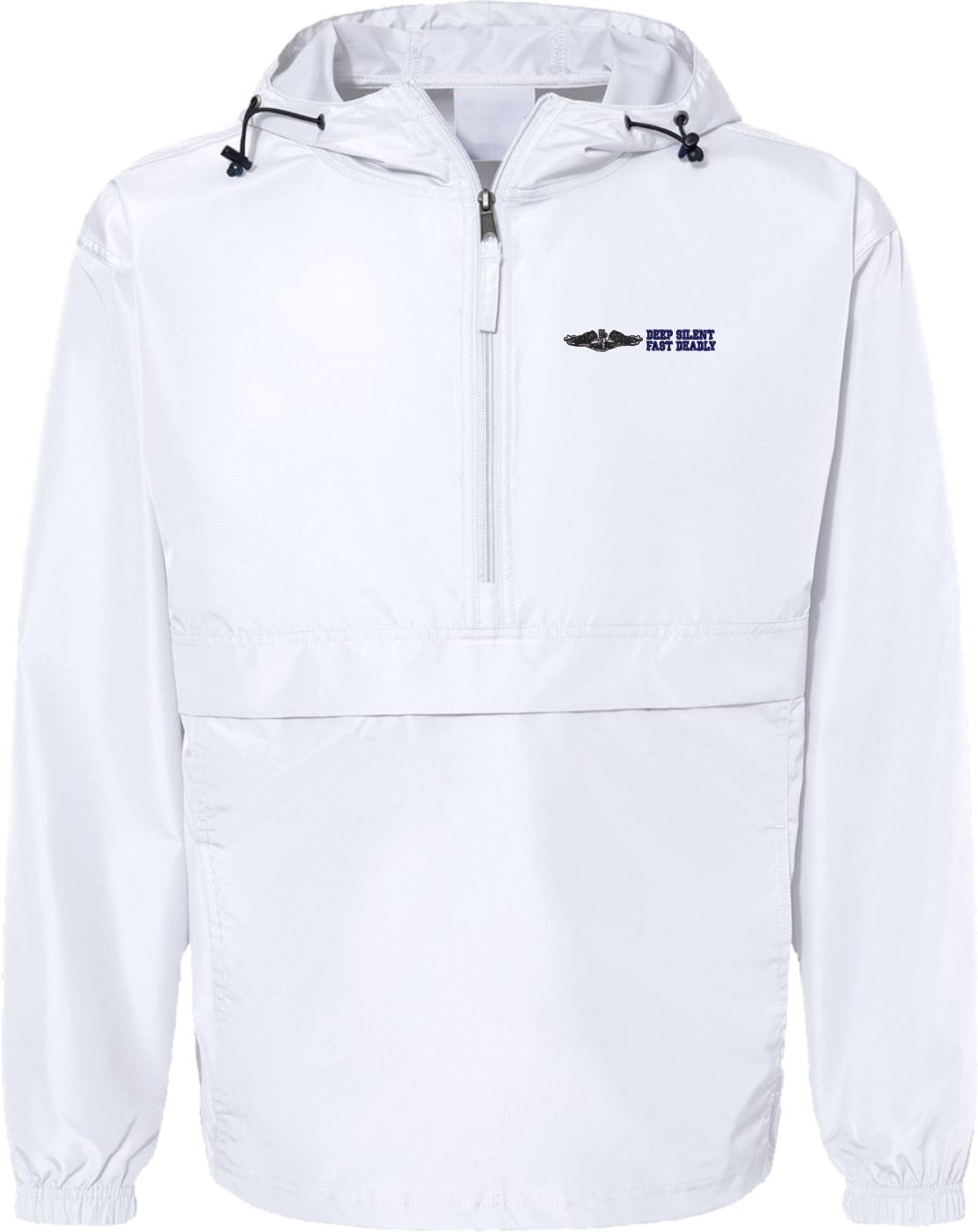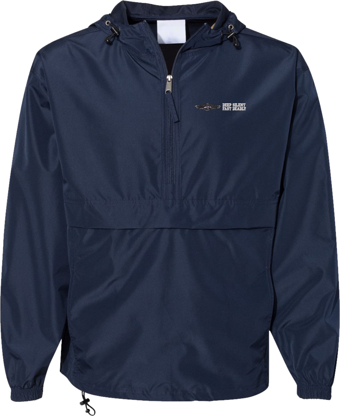 MilitaryBest is proud to offer this quality U.S. Navy Enlisted Silver Dolphins Deep Silent Fast Deadly Hooded Windbreaker. Also known as an Anorak Jacket, this windbreaker is designed to keep wind and water out. With a design embroidered over the left chest, this windbreaker is embroidered to order at our facilities in Scottsboro, AL.. This windbreaker can be packed into the mesh lined pouch pocket for a more portable method of storage.- 100% Polyester